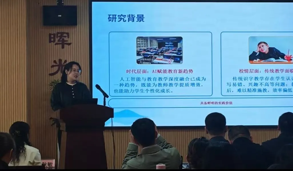 实验小学荀丹老师就《AI赋能小学语文识字教学的实践研究》,利用AI实时纠音、动态析形、智能导写,构建了“音、形、义、写、练”五维融合的低年级识字教学新范式。