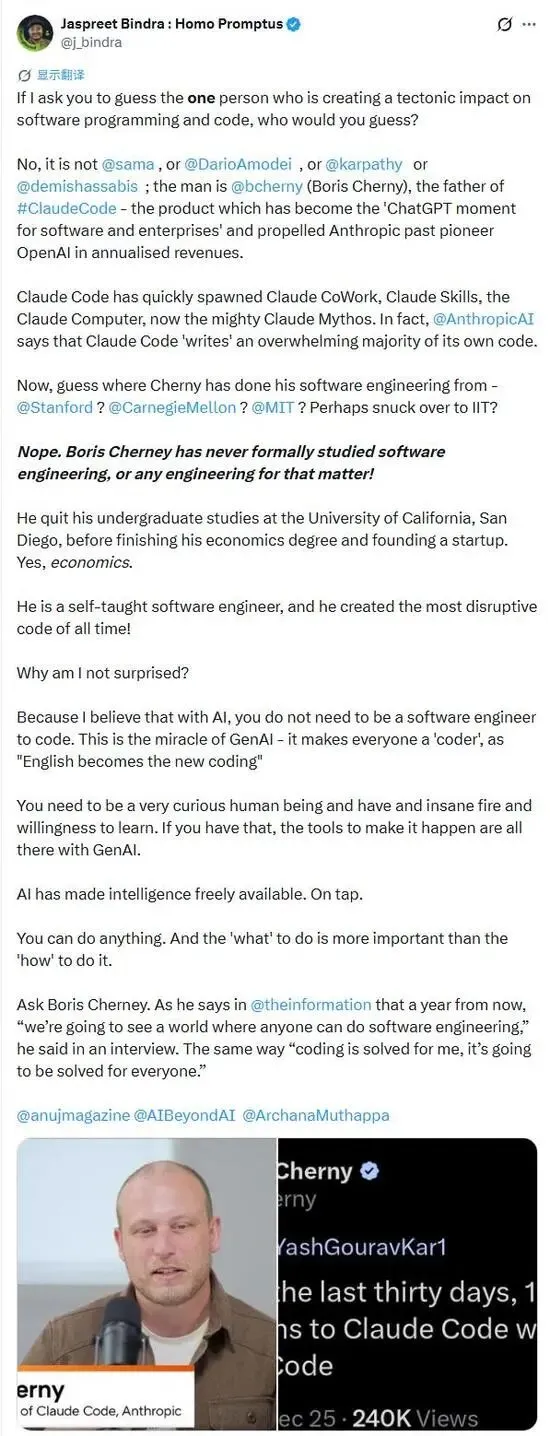 这位现年34岁的Claude Code项目负责人没有任何名校的计算机学位,他大学主修经济学并中途辍学,编程技术源于早年为eBay编写网页时的自学积累。