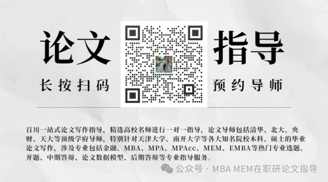 百川MBA MEM在职研论文指导,精选高校名师进行一对一指导,论文导师包括清华、北大、央财、天大等顶级学府导师,特别针对天津大学、南开大学等各大知名院校本科、硕士的毕业论文写作,涉及专业包括金融、MBA、MPA、MPAcc、MEM、EMBA等热门专业选题、开题、中期答辩、论文数据模型、后期答辩等专业指导服务。如果你有论文难题,添加崔老师微信预约论文写作导师1vs1服务,微信号:bcgp678.