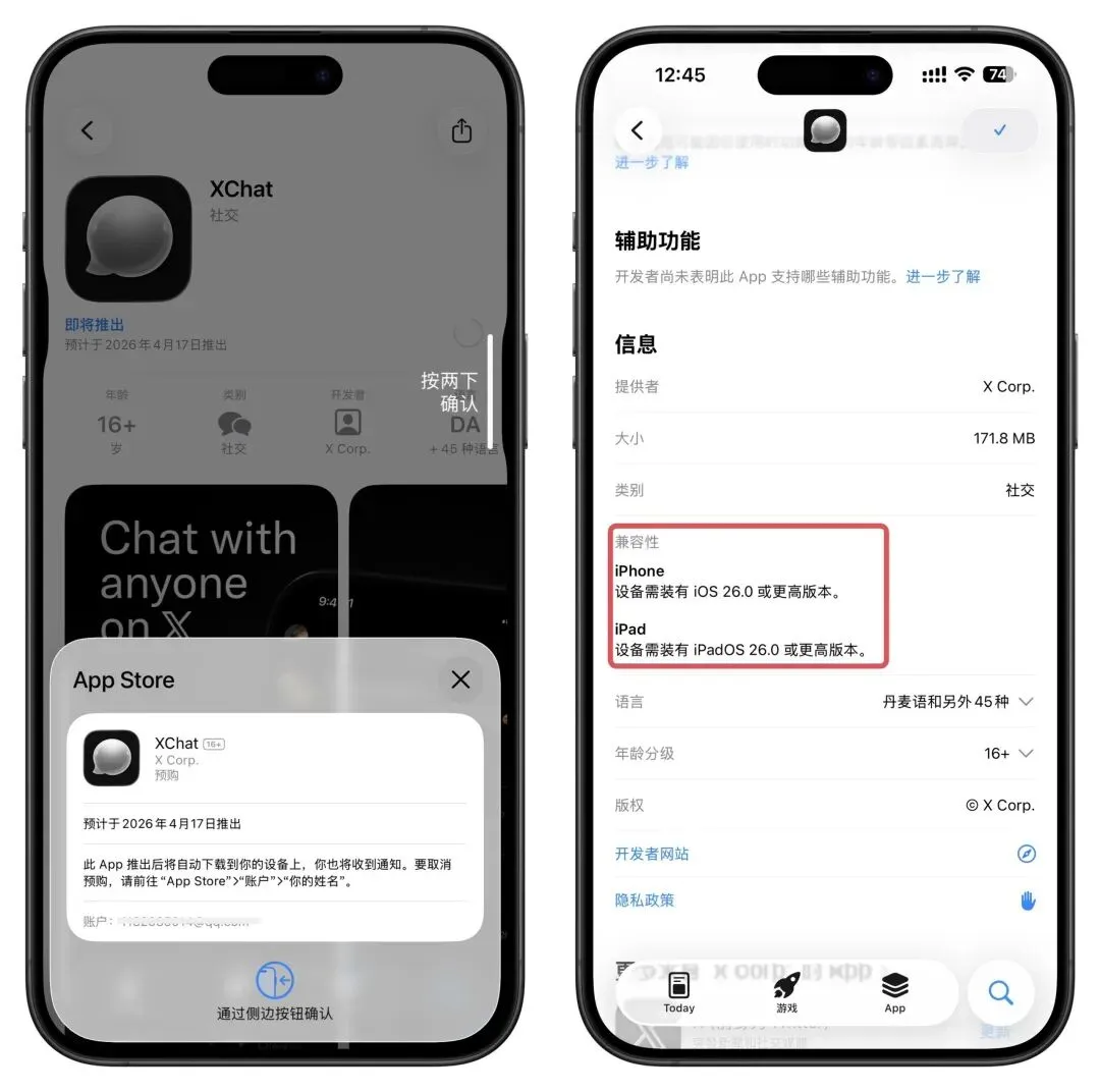 马斯克版「微信」来了,上架国区 App Store马斯克曾在公开场合表示多次表示想打造一款类似微信一样的超级应用,四年后的今天终于安排了,全新独立消息应用 XChat 将于 2026 年 4 月 17 日(也就是本周)正式登陆 App Store 。