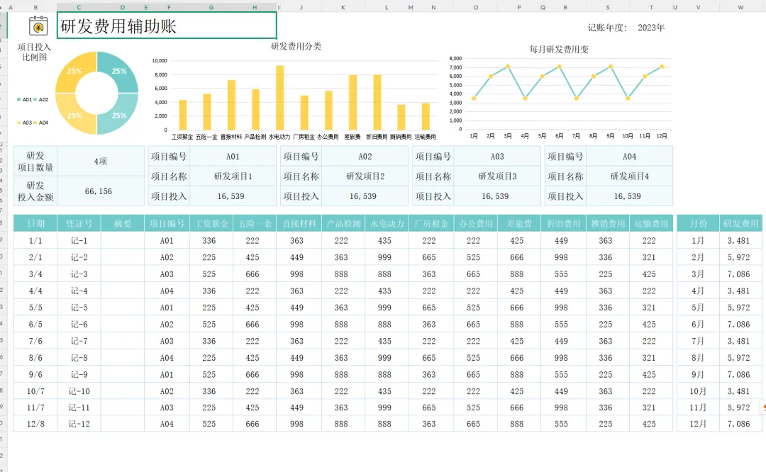 OK,看到这里,今天涉及到的研发费用支出明细表模板,都设置好了函数公式,财务人员可直接编辑修改套用即可。财务人员在日常工作中对于研发费用支出明细表的统计有难题的,可以直接套用这套表格。