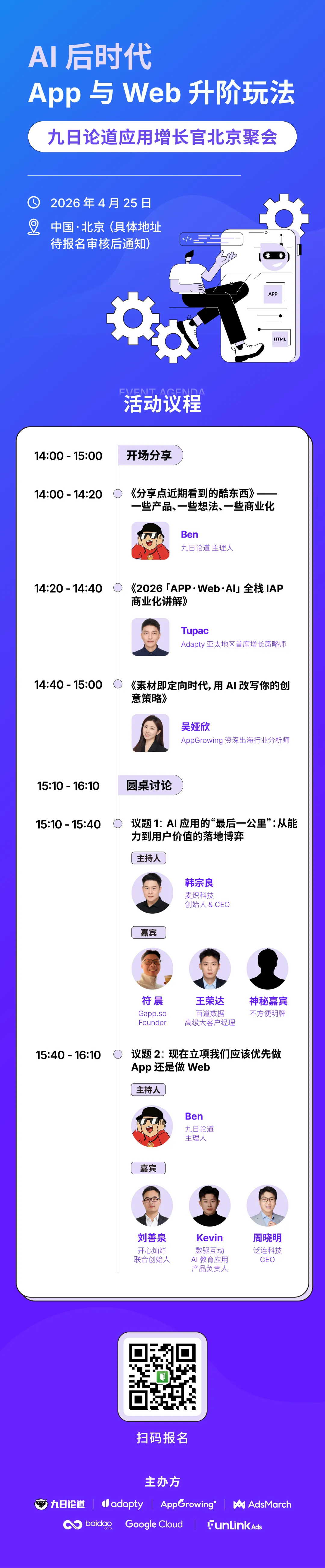 3场分享会 从九日论道主理人Ben自己最近的所见所闻梳理出来的2026Q1季度的一些发现和想法开始,到世界头部订阅变现优化SAAS软件Adapty再到广告创意素材分析头部企业AppGrowing带来的行业洞察。
