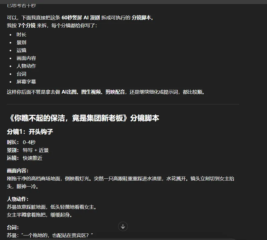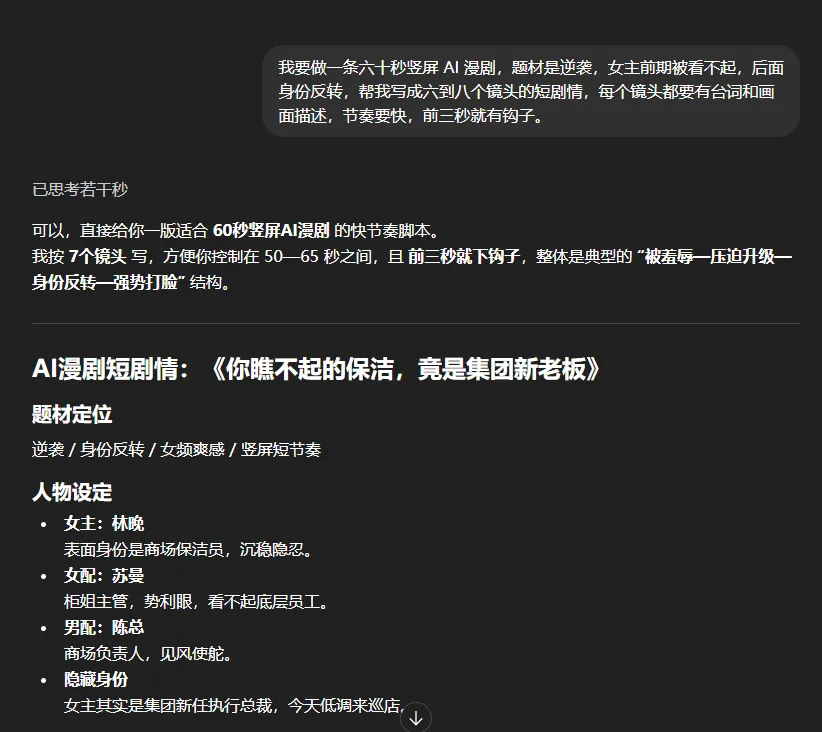 这两个月,如果你刷抖音、视频号,或者小红书刷得稍微勤一点,应该已经看过不少 AI 漫剧了。有些是霸总题材。有些是逆袭复仇。有些是一眼就能看出来,剧情其实不复杂,但就是停不下来。你再仔细看,会发现一个特别有意思的变化。过去大家聊 AI,聊的是写文案,做PPT,写代码,查资料。现在很多人已经不满足于让 AI 帮自己打下手了。他们开始直接用 AI 做内容。而且做的不是静态图,不是单张海报,不是一条口播视频。是漫剧。这事为什么值得聊呢。因为 AI 漫剧不是那种离普通人很远的新概念。恰恰相反,它现在之所以火,就是因为它把一件原本很重的事,变轻了。你想想看,传统动画或者真人短剧,门槛都很高。要人。要设备。要画师。要演员。要场地。要拍摄。要后期。任何一个环节卡住,项目就动不了。但 AI 漫剧不一样。它本质上是在用 AI 把几个最重的环节拆掉了。剧本可以先让 AI 帮你起。角色图可以让 AI 出。分镜可以让 AI 拆。配音可以让 AI 配。部分动态镜头也可以直接让 AI 生。最后再用剪映这类工具一拼,一个基础版本就出来了。这也是为什么最近很多人突然开始做 AI 漫剧。不是因为大家突然都会画画了。也不是因为大家突然都学会了做动画。而是因为这件事,第一次开始对普通人有了点可操作性。说白了,AI 漫剧最打动人的地方,不是它有多高级。而是它给了很多以前做不了内容的人,一个新的入口。你不会画。没关系。你不会拍。也没关系。你甚至不会剪复杂的视频。也不是不能开始。当然了,这不等于它没有门槛。门槛还是有。只是门槛从以前那种完全进不去,变成了你至少能先迈一只脚进去。回到这块,如果你是一个小白,现在看到 AI 漫剧很火,也有点心动,最想知道的其实不是行业有多大。你最想知道的是,我到底能不能做出第一条。我的答案是,能。但你别一上来就想着做一部长篇。你先做出第一条三十秒到六十秒的竖屏漫剧,才是最现实的起点。这才是重点。先别想着做大。先把第一条跑通。最近全网爆火的酱板鸭,成为了现象级热点。底层其实就是选材和反转,通过无限的反转刺激观众的爆点。同时具备二创的潜质。其实一个现象级爆火的短剧,底层逻辑非常简单。如果你真的想开始,我建议你按一个最小流程来。别一上来就研究什么工业化生产,什么矩阵投放,什么批量起号。那些东西离你还远。你先把一条做出来。流程其实没那么复杂。第一步,先选一个特别适合漫剧的题材。这一块很重要。不是所有内容都适合做 AI 漫剧。AI 漫剧最适合的,是那种情绪强、冲突快、人物关系清楚、画面感明显的内容。比如逆袭。比如复仇。比如豪门。比如校园反转。比如古风爽文。比如悬疑小反转。为什么这些题材适合。因为漫剧本身就不是靠复杂演技取胜的,它更像是一种节奏很快、信息密度很高的视觉表达。你给它一个平铺直叙的故事,它很容易没劲。但你给它一个开头就有钩子的设定,它就容易跑起来。所以你做第一条的时候,别自己硬憋世界观。真的没必要。你就老老实实找一个最有传播性的微剧情。一句话就能讲明白的那种。比如,穷女孩被瞧不起,结果真实身份曝光。比如,一个外卖员误入豪门局。比如,离婚当天前夫才发现她早就翻盘了。这类东西听着有点俗,对吧。但坦率的讲,很多短内容能跑,就是因为它先解决了一个问题。让人看下去。第二步,先把剧情写成一版极短脚本。这一块你完全可以交给 AI 帮你起草。比如你可以直接告诉 ChatGPT、Kimi、豆包这一类工具。我要做一条六十秒竖屏 AI 漫剧,题材是逆袭,女主前期被看不起,后面身份反转,帮我写成六到八个镜头的短剧情,每个镜头都要有台词和画面描述,节奏要快,前三秒就有钩子。你看,问题一旦问具体了,AI就会好很多。这时候你不要期待它一次就给你神稿。你要做的是拿它给的第一版,自己去删,去改,去收。记住一件事。剧情没钩子,后面工具再花哨都没用。所以你在这一步最重要的工作,不是技术。是判断。前三秒够不够抓人。反转来得够不够快。台词会不会太啰嗦。每一句话有没有推动情节。如果没有,就继续改。第三步,把脚本拆成分镜。这一块是很多小白第一次最容易慌的地方。其实没那么复杂。你就把它理解成,把刚才那段短剧情拆成一格一格要画出来的画面。比如第一个镜头,女主被羞辱。第二个镜头,镜头切近,表情冷下来。第三个镜头,反派继续输出。第四个镜头,车门打开。第五个镜头,保镖出现。第六个镜头,身份反转。你看,本质上就是这么回事。这时候你可以继续让 AI 帮你把每个镜头的画面描述写出来,尽量写清楚人物、动作、场景、机位、情绪。写得越具体,后面出图越稳。很多人第一次做不顺,不是工具不行。是他前面喂给工具的东西太糊了。第四步,开始做角色图和场景图。这一步才是很多人真正觉得,哦,原来这事开始像样了。你可以用即梦、Midjourney,或者别的出图工具,先把主角、反派、场景做出来。这里最关键的不是一上来就追求神图。而是角色一致。你第一条 AI 漫剧,最容易翻车的地方,不是画得不够好看。而是同一个女主,前一张长这样,后一张直接像换了个人。那就很出戏。所以新手最稳的办法,不是疯狂堆花里胡哨的提示词。而是先把主角色定住。服装。发型。脸型。年龄感。整体画风。这些尽量先统一。你宁可先