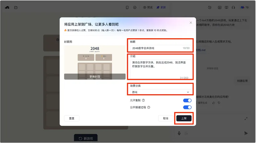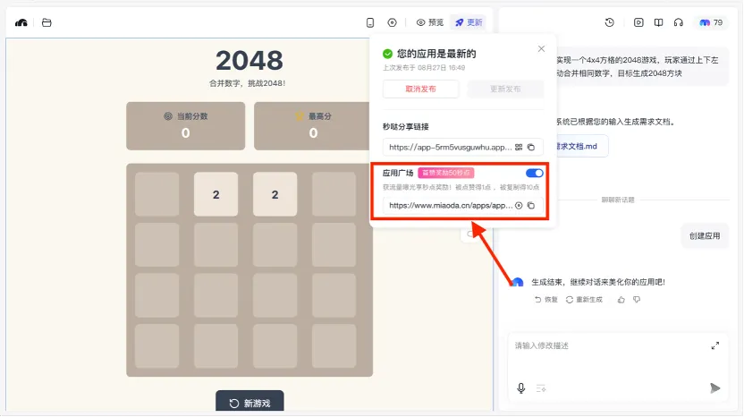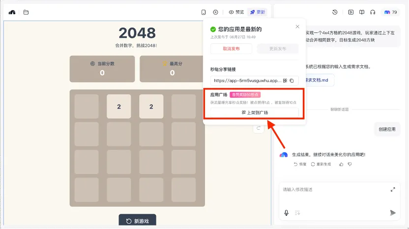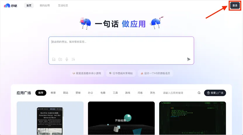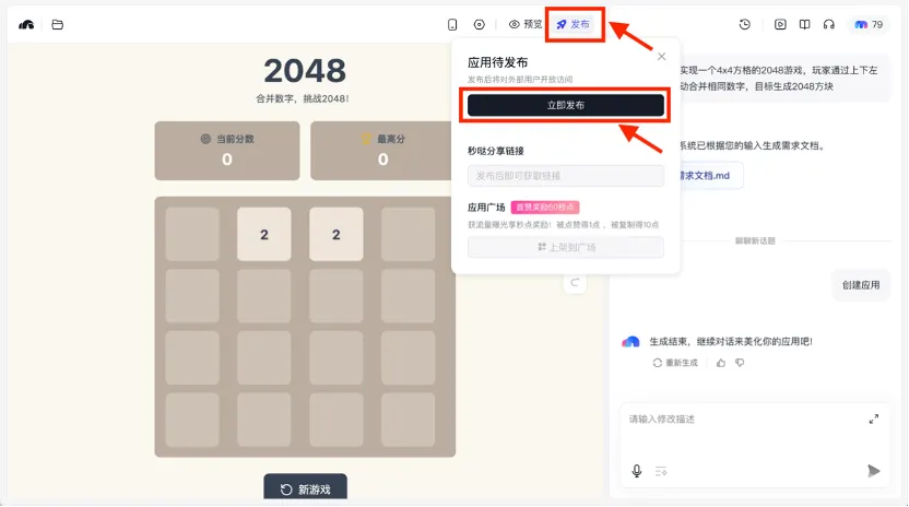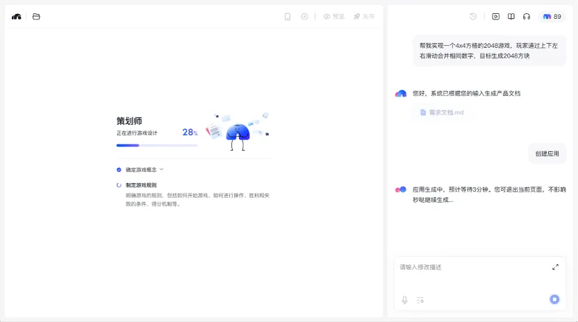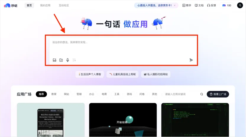在首页的大框框里,你可以像对朋友说话一样,输入你想做的应用。比如我们今天要做2048游戏,就输入: