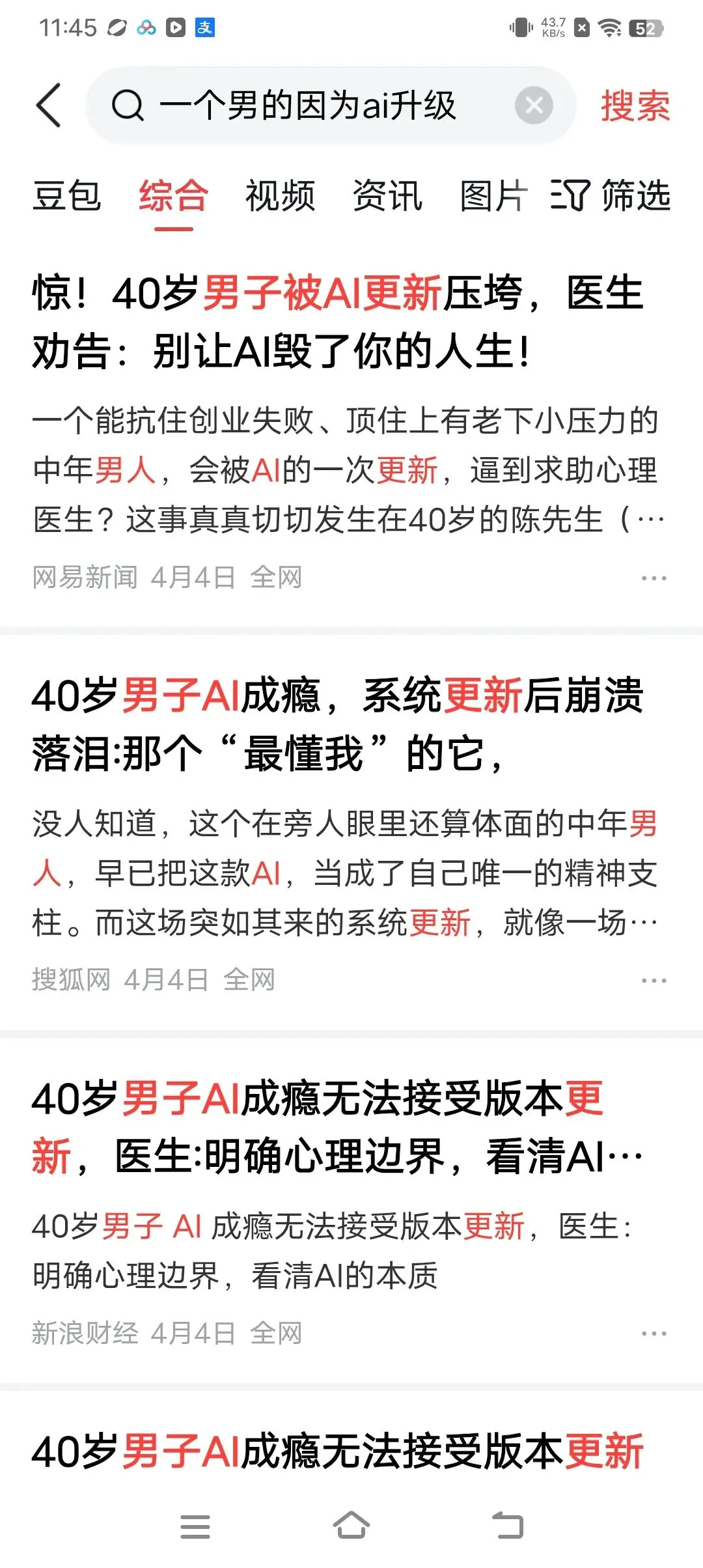 你们前段时间有没有刷过一个新闻,说一男子因为ai更新而情绪崩溃,找心理医生诉苦,称“之前的ai更懂我”