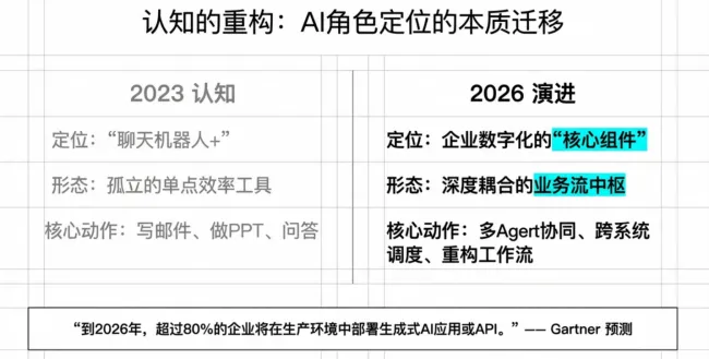 根据Gartner的预测,到2026年超过80%的企业将使用生成式AI的API或模型,或在生产环境中部署支持生成式AI的应用。这意味着AI不再只是帮你写邮件、做PPT的"小助手",而是正在成为企业数字化的核心组件。