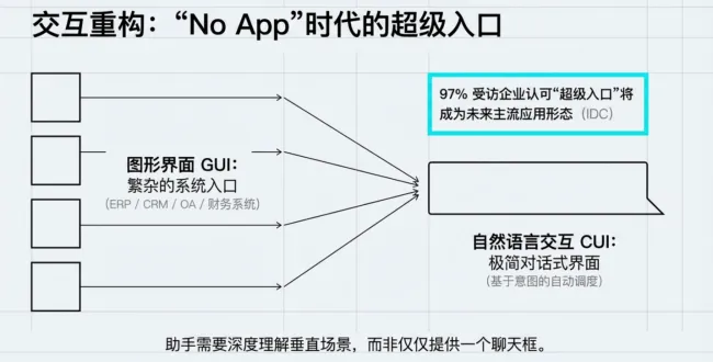 据IDC调研显示,97%的受访企业认可超级入口将成为未来的主流应用形态。基于自然语言的极简交互将替代一部分传统的图形界面交互,"No App"理念将重塑移动互联网时代形成的入口和用户格局。
