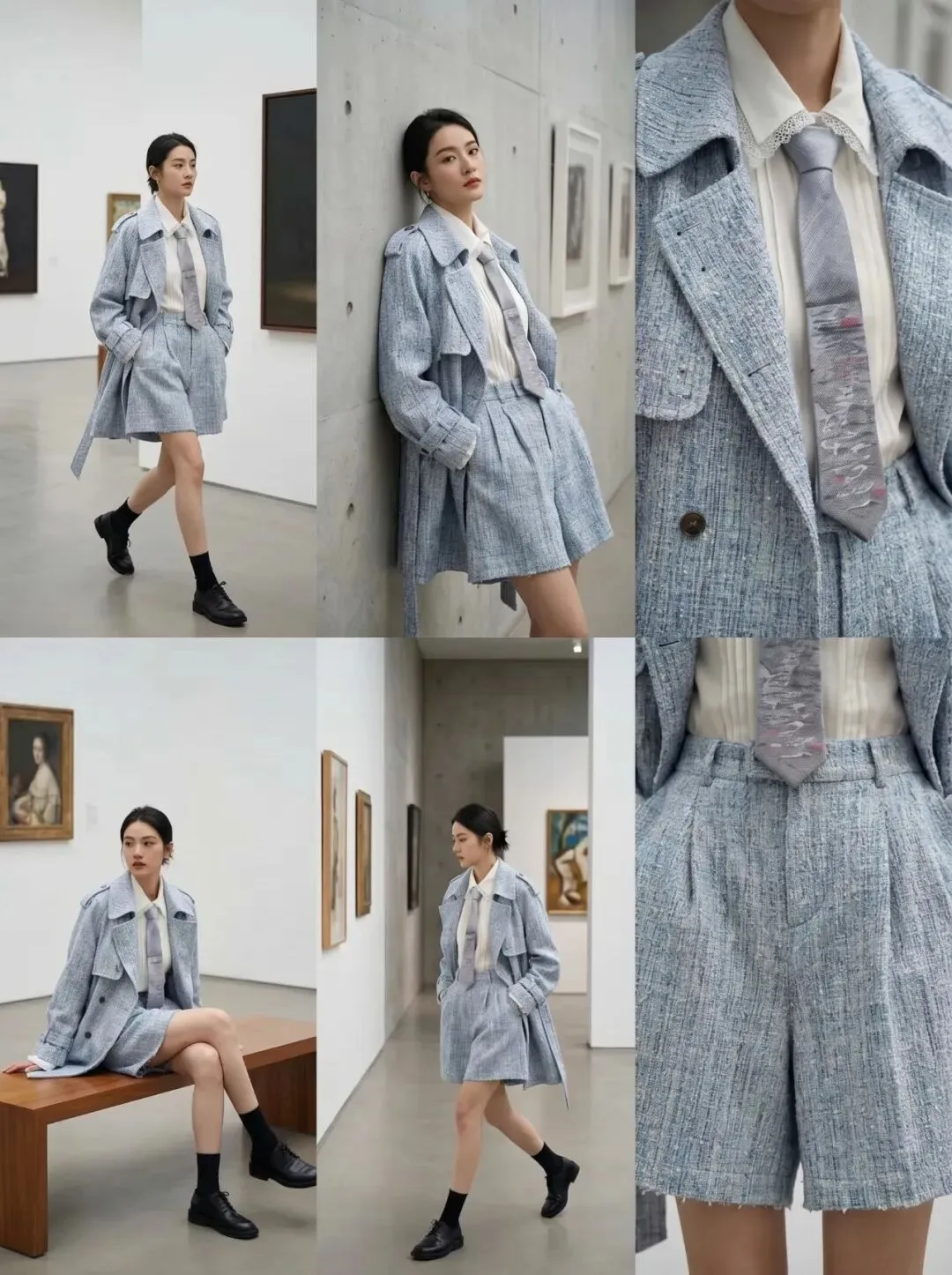 提示词:#【请务必生成一张符合以下描述的图像】,按照下列要求生成模特穿着这套衣服与穿搭的6连拍特写全身图,视角:全身、半身、衣服细节,姿势:走路、坐姿、靠墙,背景:美术馆,画廊,#其他细节:保持服装款式与搭配,面料质感,颜色,文字,图案,纹理,细节不变。相机拍摄真实风格。 赶紧去试试,解锁产品连拍新方式,用最少的时间,做最精致的产品展示吧!