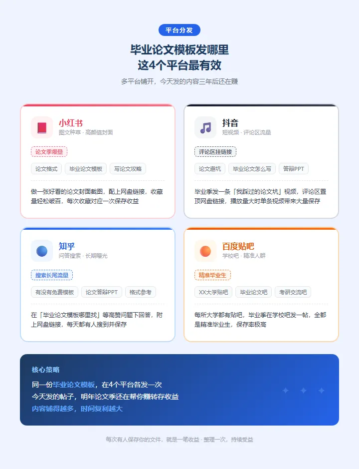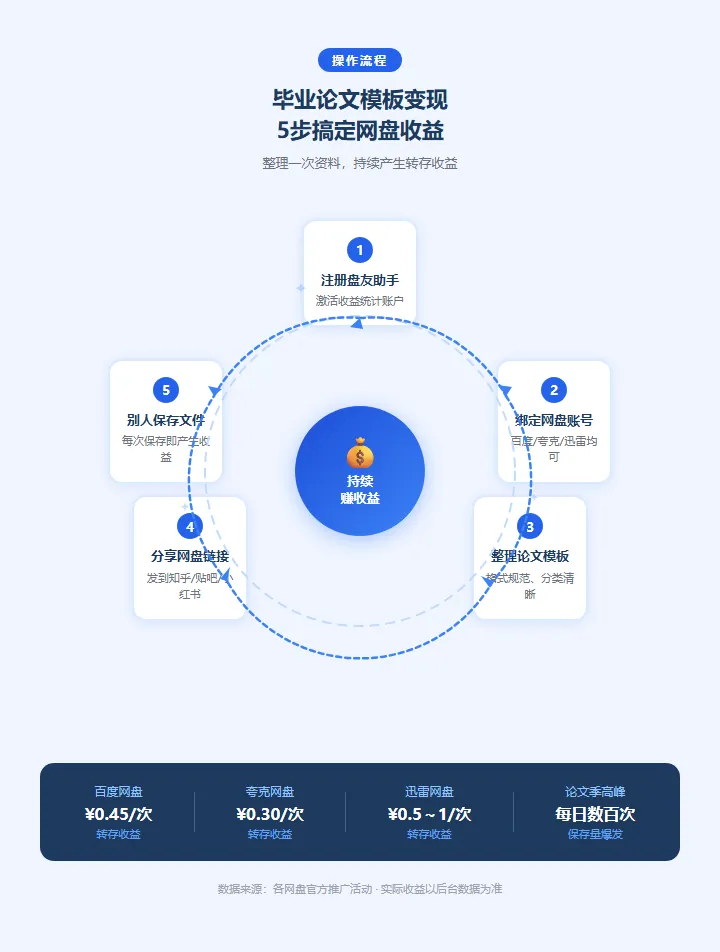 毕业论文模板背后藏着一笔没人告诉你的收益「有没有毕业论文模板推荐」「求分享论文格式参考」「哪里有免费的毕业论文模板下载」这些帖子的评论区里,有一类人每次都在默默分享网盘链接他们把自己整理的毕业论文模板打包上传到百度网盘,放到评论区、群文件、帖子里先说清楚一件事——百度网盘这类平台,有自己的推广机制百度网盘:拉新¥12/人,转存¥0.45/次,会员分佣10%~20%夸克网盘:拉新¥7/人,转存¥0.3/次,会员分佣30%迅雷网盘:拉新¥6~15/人,转存¥0.5~1/次,会员分佣40%每年毕业季,搜「毕业论文模板」的人比平时多出好几倍论文模板不是随便看看的内容——用户搜到之后,几乎百分之百会保存下来一份毕业论文模板,被保存几十次、上百次,是完全正常的事你手里很可能有现成的格式参考、答辩PPT、写作框架这些对你来说没什么用的东西,对当届毕业生来说是刚需这一步是激活收益统计的关键——网盘APP本身不显示推广收益,只有通过盘友助手才能看到你的佣金数据生成分享链接,发到小红书、贴吧、知乎的相关讨论帖下面如果有人通过你的链接第一次注册了百度网盘,还会额外触发一笔拉新佣金我认识一个做考研资料分享的博主,后来也开始分享毕业论文模板但等后台数据跑起来,某个论文季的周末,一天的转存收益超过了她一天的工资她的第一反应不是兴奋,是愣了一下:「我之前白做了多少年?」但做顺手了,把毕业论文模板这类内容铺到多个平台——再往后,你可以把毕业论文模板扩充成一个「论文写作资源包」开题报告模板、参考文献格式、降重方法合集、答辩PPT框架毕业季年年有,毕业论文模板的需求不会因为今年有人做了就消失这不是争时间窗口的事——它是一个需求持续存在的长期项目盘友助手注册入口在这里,感兴趣的话可以从这里了解具体操作流程注册后,在「盘友助手」公众号后台回复【教程】领取完整推广教程