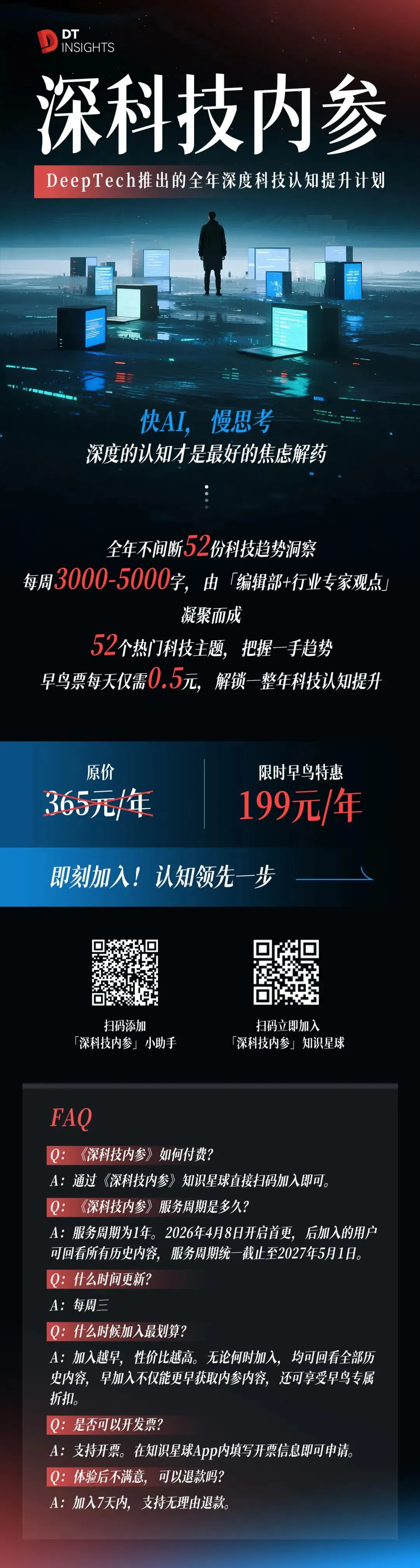 如果你正陷入这样的困境:寻找风口却迷失在 AI 颠覆一切的喧嚣中,担心决策失误却看不清技术真伪,渴望认知升级却没有认知框架,想链接顶尖大脑却困于信息孤岛——那么,《深科技内参》将是 2026 年你最值得选择的认知资产。