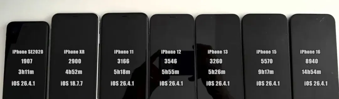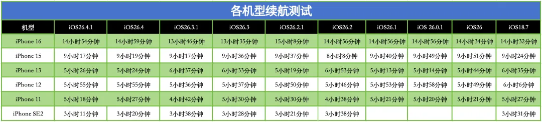 iOS 26.4.1 正式版续航出炉,包含 6 款iPhone!苹果发布了iOS 26.4.1正式版,主要就是针对iPhone错误修复和安全性更新。iAppleBytes 博主测试了iOS 26.4.1正式版续航,测试机型分别是:iPhone 16、iPhone 15、iPhone 13、iPhone 12、iPhone 11、iPhone SE2。6款机型电池健康如图所示:测试的机型相同的亮度、根据GeekBench电池测试功能,记录每款iPhone从100%的电量直到关机时间。6款机型测试结果如下:从测试结果来看,对比iOS 26.4 来看iPhone 13 续航对比上个版本增加2分钟iPhone 16续航下降5分钟、iPhone 15续航下降2分钟、iPhone 11续航下降9分钟、iPhone SE2 续航下降9分钟升级建议:iOS 26.4.1 正式版续航对比上个版本并没有多大的区别,下降最多的时间也只有9分钟,如果你目前系统没有遇到iCloud问题和Wi-Fi 断流问题可以选择不用更新。以上就是iOS26.4 正式版续航结果,仅测试数据,不代表日常使用,不代表大家最终结果,仅供参考。iOS 26.4.1 正式版发布一段时间,大家体验如何?