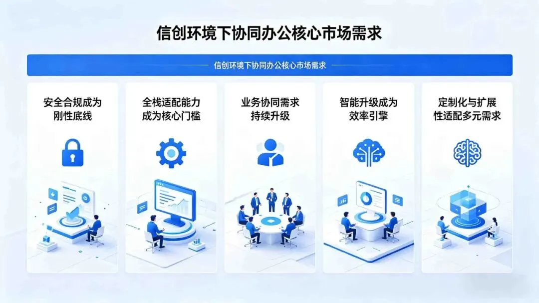 信创环境下的协同办公需求,已彻底摆脱“基础可用”的初级阶段,转向“安全合规、全栈适配、智能高效、灵活定制”的综合需求,且不同行业呈现差异化特征,核心可概括为五大维度。