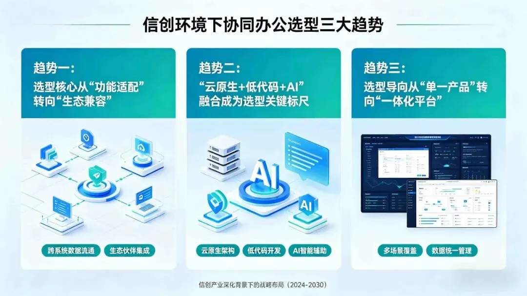 随着信创产业的全面深化,协同办公系统的选型已不再是“简单替换”,而是立足当下合规需求、着眼未来5-10年数字化升级的战略布局,核心呈现三大趋势。