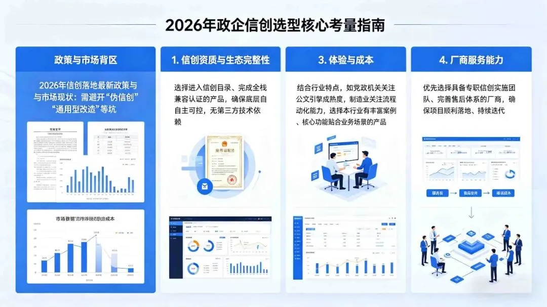 结合2026年信创落地最新政策与市场现状,政企单位选型时需避开“伪信创”“通用型改造”等坑,聚焦四大核心考量,实现科学选型。
