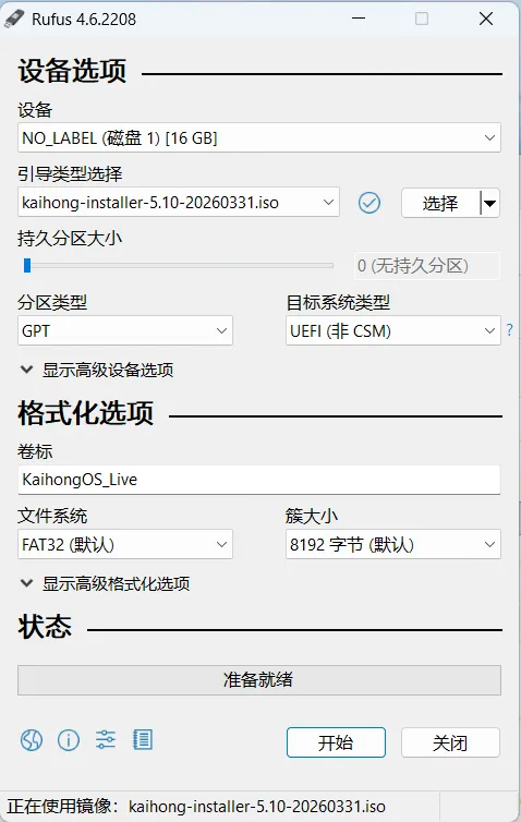 选择后点击打开,然后在Rufus软件界面点击开始,它就会开始制作U盘启动了,这里写入的速度取决于你的电脑接口和U盘接口协议,USB3.0蓝色接口的速度会快一点。