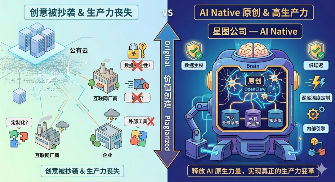 总结一句话: 云厂商推套壳是为了让你依赖它;星图倡导 AI Native 私有化是为了让你变强大。