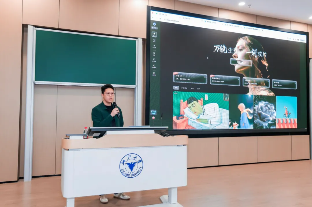 为让师生直观感受AI创作的魅力,阿里云视频云高级产品经理杜浦向现场展示了AI视频与平面创作平台“万镜一刻”。他介绍,该平台依托千问系列模型能力,打造了端到端、工业级的AI创作流水线。杜浦详细演示了“参考生视频”、“图生视频”及创新的“九宫格多参生视频”模式,展现了平台在精准控制人物站位、音画同步编辑及镜头运镜等方面的高阶能力。