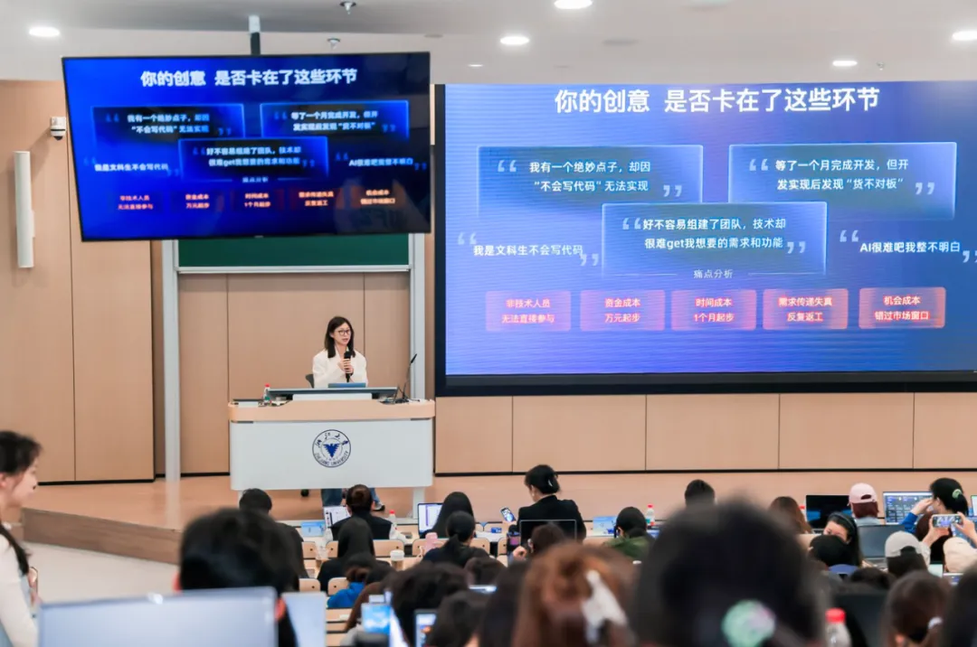 活动现场,阿里巴巴AI产品运营专家黄韵首发揭秘了阿里云云端AI全栈应用开发平台——“秒悟”。该平台专为打破传统开发的“代码壁垒”与“沟通鸿沟”而生。通过“自然语言对话”与“参考图生应用”两大核心能力,即使是无技术背景的文科或艺术类师生,也能在“分钟级”内完成一款AI应用的搭建。