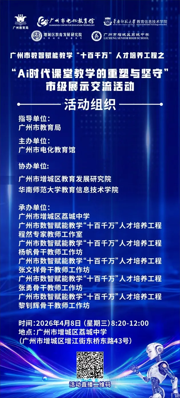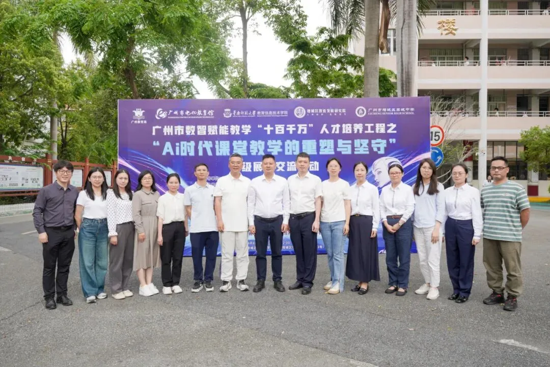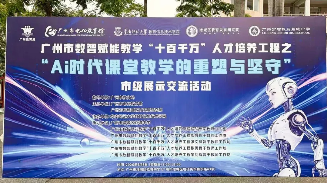4月8日,广州市数值赋能教学“十百千万”人才培养工程之“AI时代课堂教学的重塑与坚守”市级展示交流活动在荔城中学圆满落幕。本次活动由广州市电化教育馆主办,广州市增城区教育发展研究院、华南师范大学教育信息技术学院协办,由广州市增城区荔城中学、广州市数智赋能教学“十百千万”人才培养工程程然专家教师工作室、广州市数智赋能教学“十百千万”人才培养工程杨帆骨干教师工作坊、广州市数智赋能教学“十百千万”人才培养工程张文祥骨干教师工作坊、广州市数智赋能教学“十百千万”人才培养工程张勇骨干教师工作坊、广州市数智赋能教学“十百千万”人才培养工程黎钊辉骨干教师工作坊共同承办,活动汇集了来自广州市的专家、学者与一线教师,通过课例展示、微讲座、同课异构、圆桌论坛等多维形式,共同呈现了一场关于数智赋能教学的“思想风暴”与“实践巡礼”。