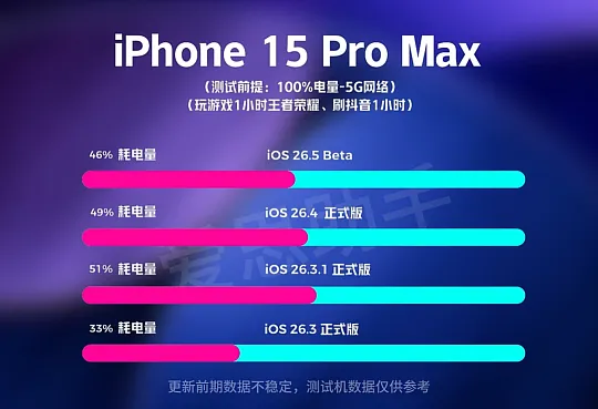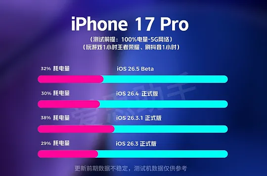 “我的 iPhone 17 Pro Max 升级后,晚上回到家还有 30% 电,以前这会儿早红了”,“别动,我这台 iPhone 13 升完刷半小时短视频就发热,电量掉得很快”,更新弹窗一来,群聊里就这样说开了,苹果把 iOS 26.5 推出来了,全球推送,上手的多,数据也快,爱思助手的跑分续航,iAppleBytes 的标准化测试,再加上早期用户的几千条反馈,拼到一块能看出一个规律,续航像被分了档,新机能多撑一点,老机负担重了点,自己那台在哪一边,挺明确的。