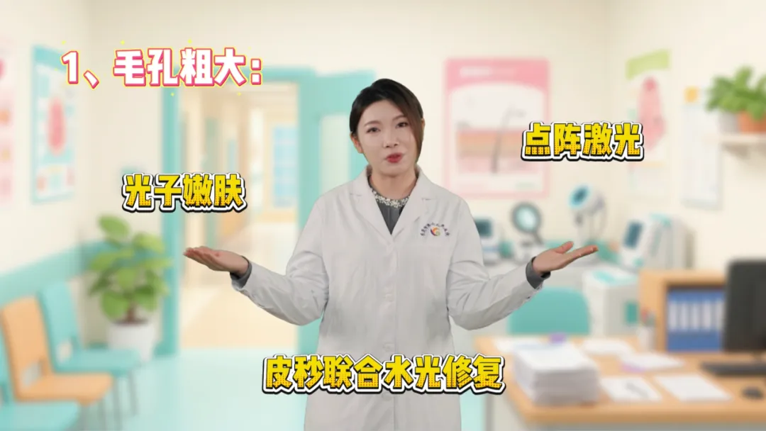 毛孔粗大:光子嫩肤、点阵激光、皮秒联合水光修复,都能让毛孔“光荣毕业”。