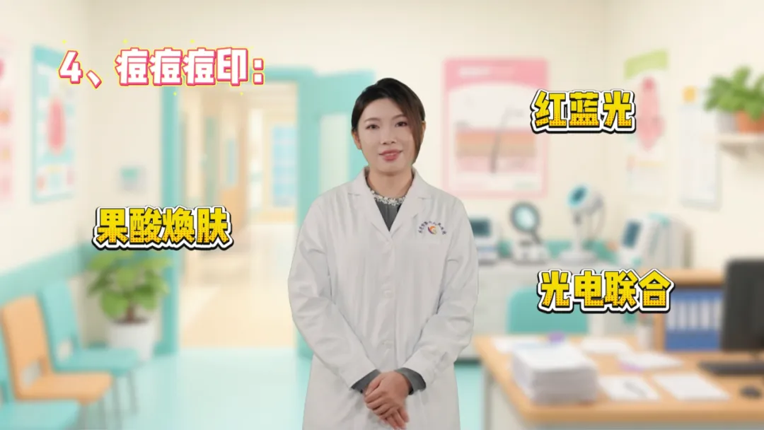 痘痘痘印:红蓝光、果酸焕肤、光电联合,能让你从“月球脸”回归光滑脸蛋。