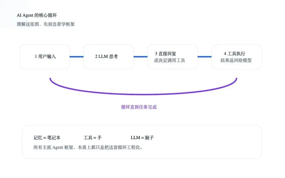 图 1:Agent 的本质不是“魔法”,而是模型思考、调用工具、拿结果再判断的循环。