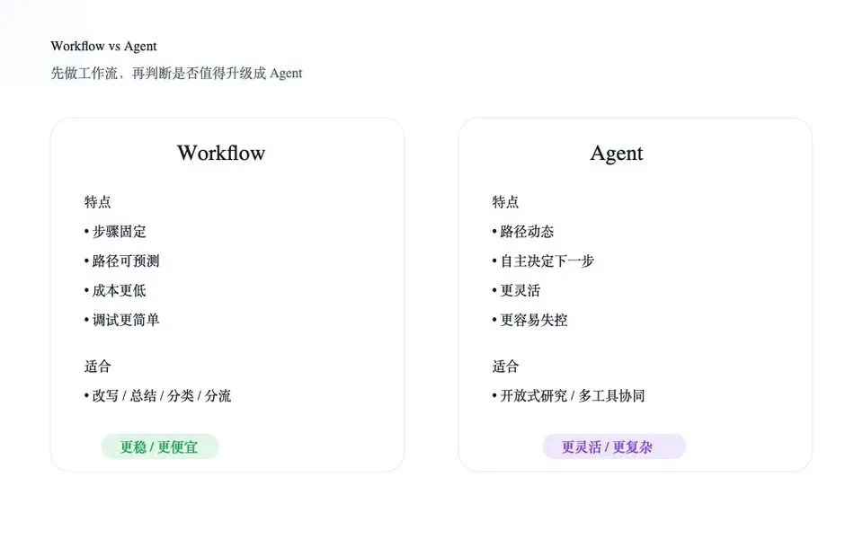 一个更成熟的思路是:先用最简单的工作流跑通,再决定值不值得升级成 Agent。