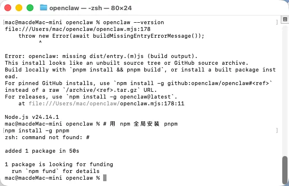 dist/entry.js 缺失那么 用 npm 全局安装 pnpmnpminstall-gpnpm