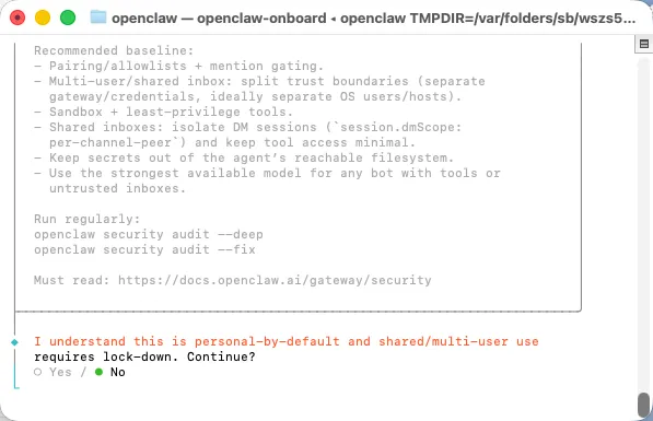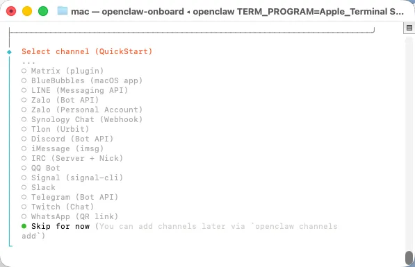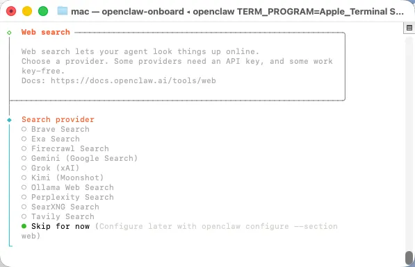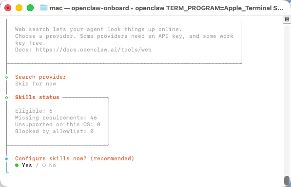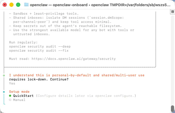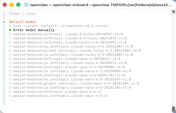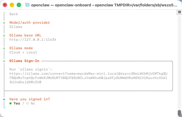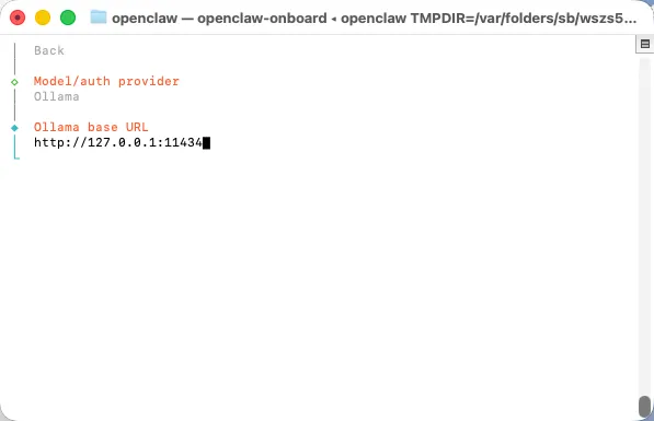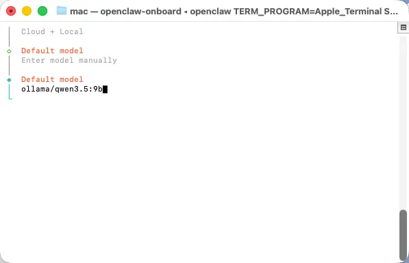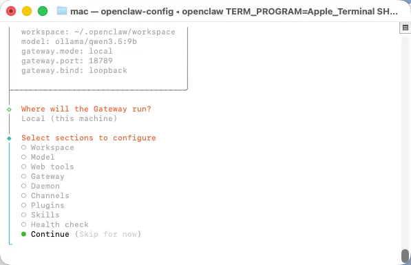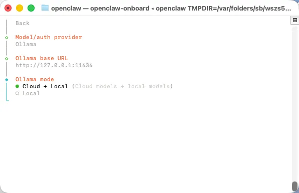 安全确认选 Yes安装模式选 QuickStart模型提供商选 Ollama地址保持默认 http://127.0.0.1:11434,回车模式选 Cloud + Local,回车登录确认选 No(纯本地用不上)默认模型选 Enter model manually,输入你的本地模型(比如llama3.2)
