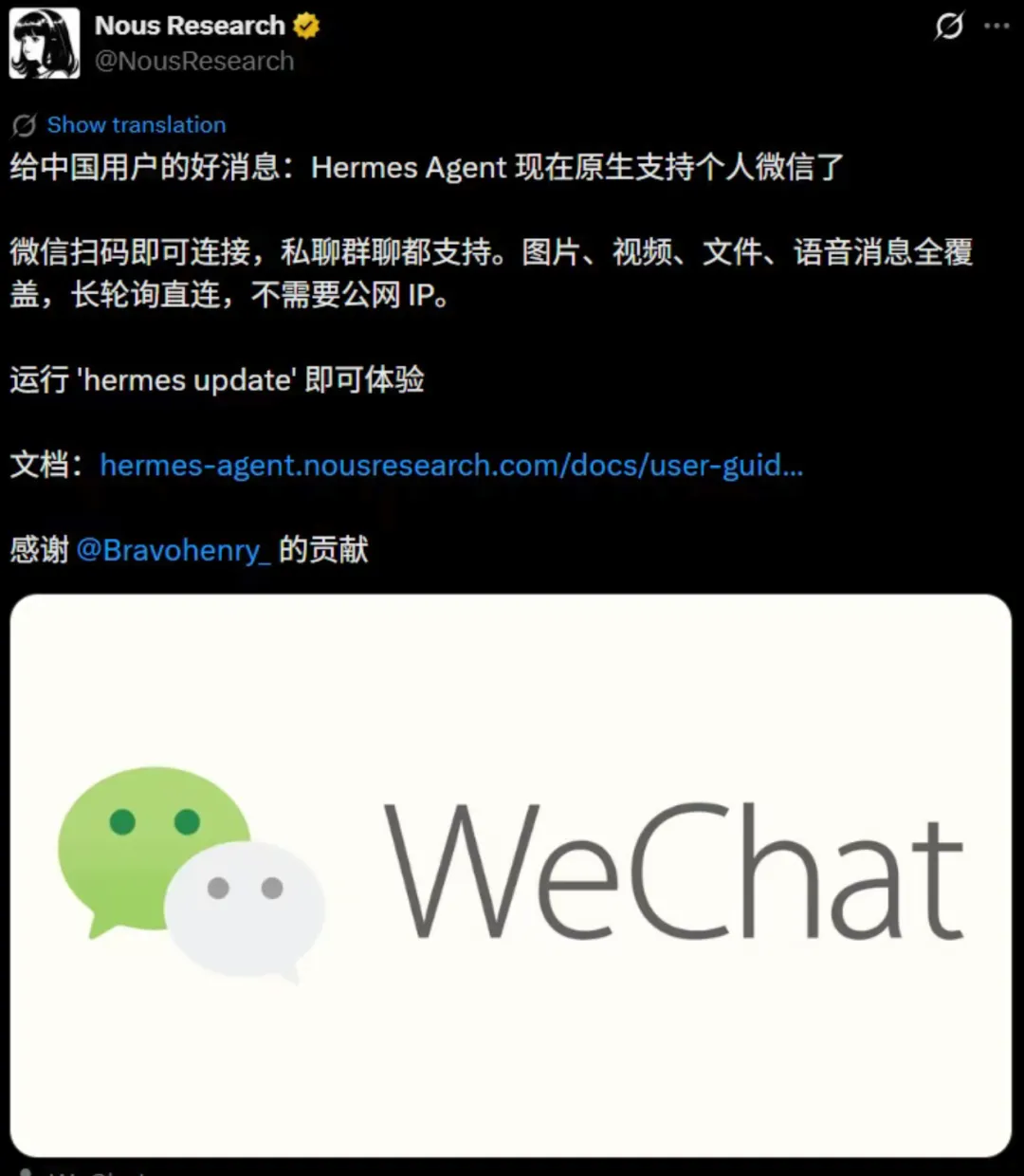 Hermes原生支持把个人微信接进来,用的是官方iLink接口,不是那种随时可能失效的第三方破解协议,在终端跑一行命令、扫个码,几秒钟之后微信里就住进了一个带进化能力的AI,连"正在输入"的状态都能同步显示出来,这个功能在国内开发者圈子里传得挺广。