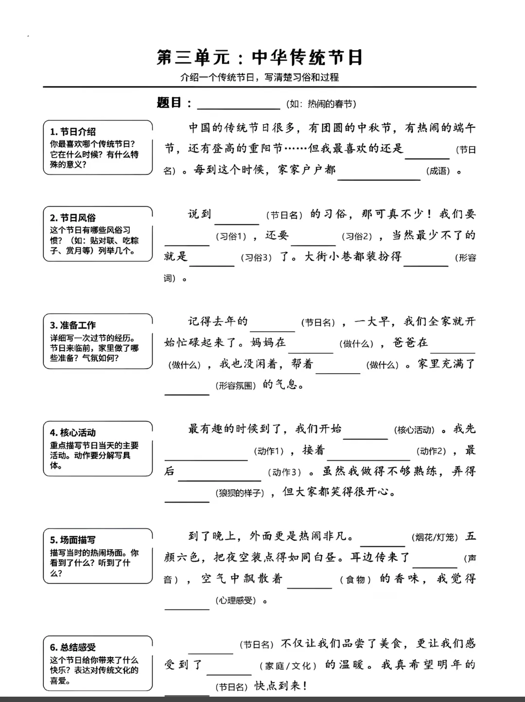 1. 选自己最熟的节日写(春节/端午/中秋),不用写复杂的词;