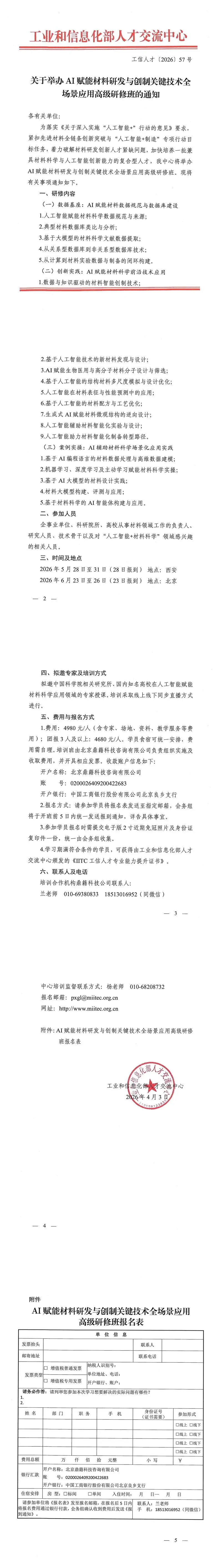 关于举办AI赋能材料研发与创制关键技术全场景应用高级研修班的通知推荐阅读1.中心与教育部学生服务与素质发展中心战略合作签约仪式顺利举行2.中心与比亚迪股份有限公司签署战略合作协议3.关于征集鸿蒙人才发展促进工作组成员单位的通知4.第一届(2025)高新技术创新发展大会成功举办5.关于公布2025年首批IITC工信人才岗位能力评价业务合作机构目录的通知6.关于公布企业经营管理“头雁人才”培养计划合作机构目录的通知