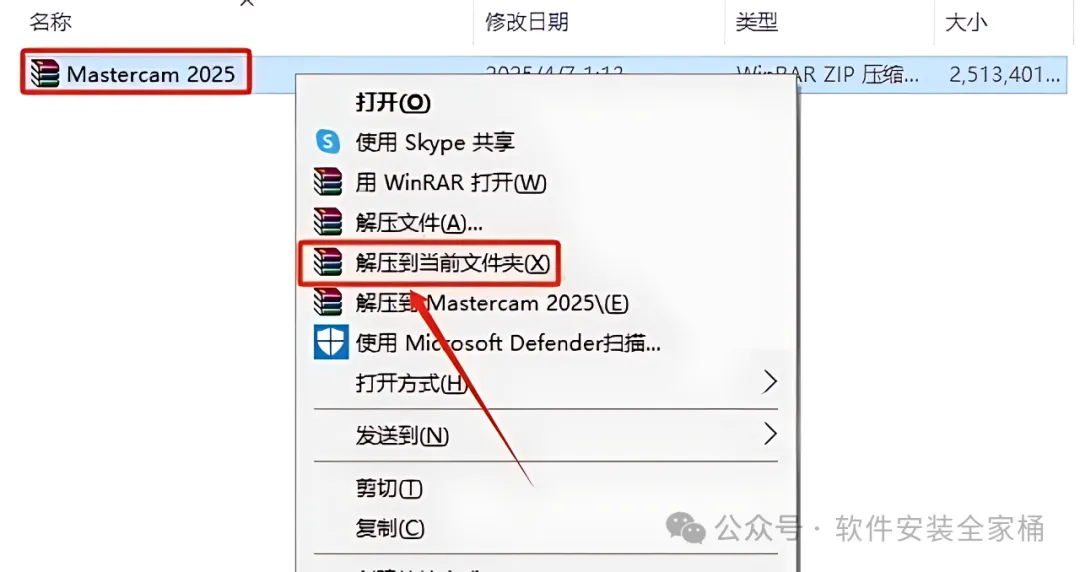 1.打开下载的Mastercam软件安装包,鼠标右击压缩包选择【解压到当前文件夹】。