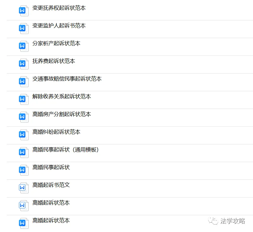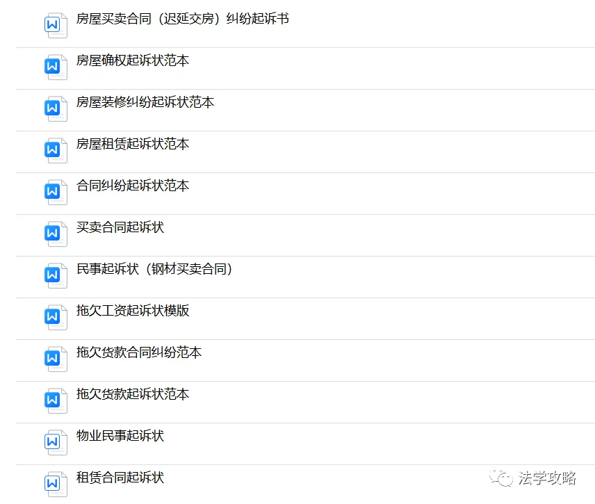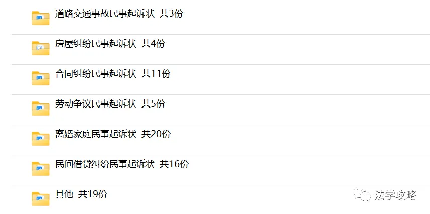 包括:道路交通事故民事起诉状 共3份 房屋纠纷民事起诉状 共4份 合同纠纷民事起诉状 共11份 劳动争议民事起诉状 共5份 离婚家庭民事起诉状 共20份 民间借贷纠纷民事起诉状 共16份 其他 共19份