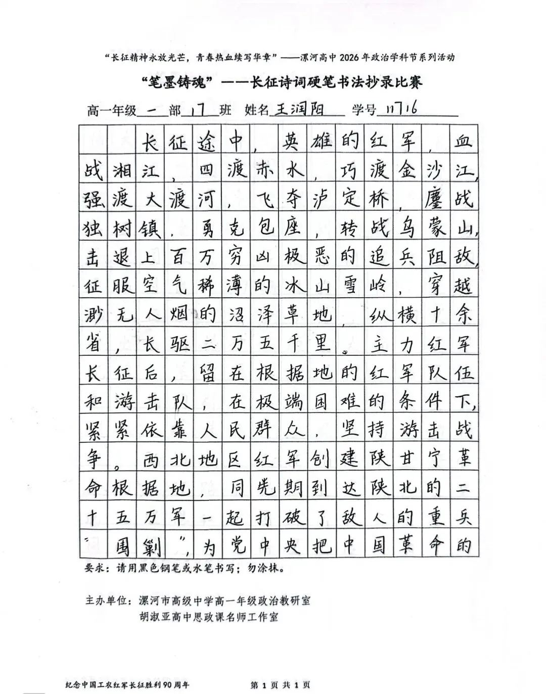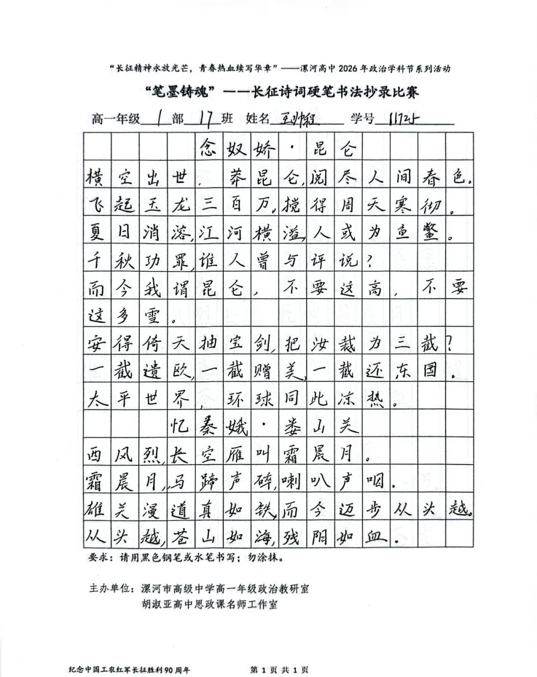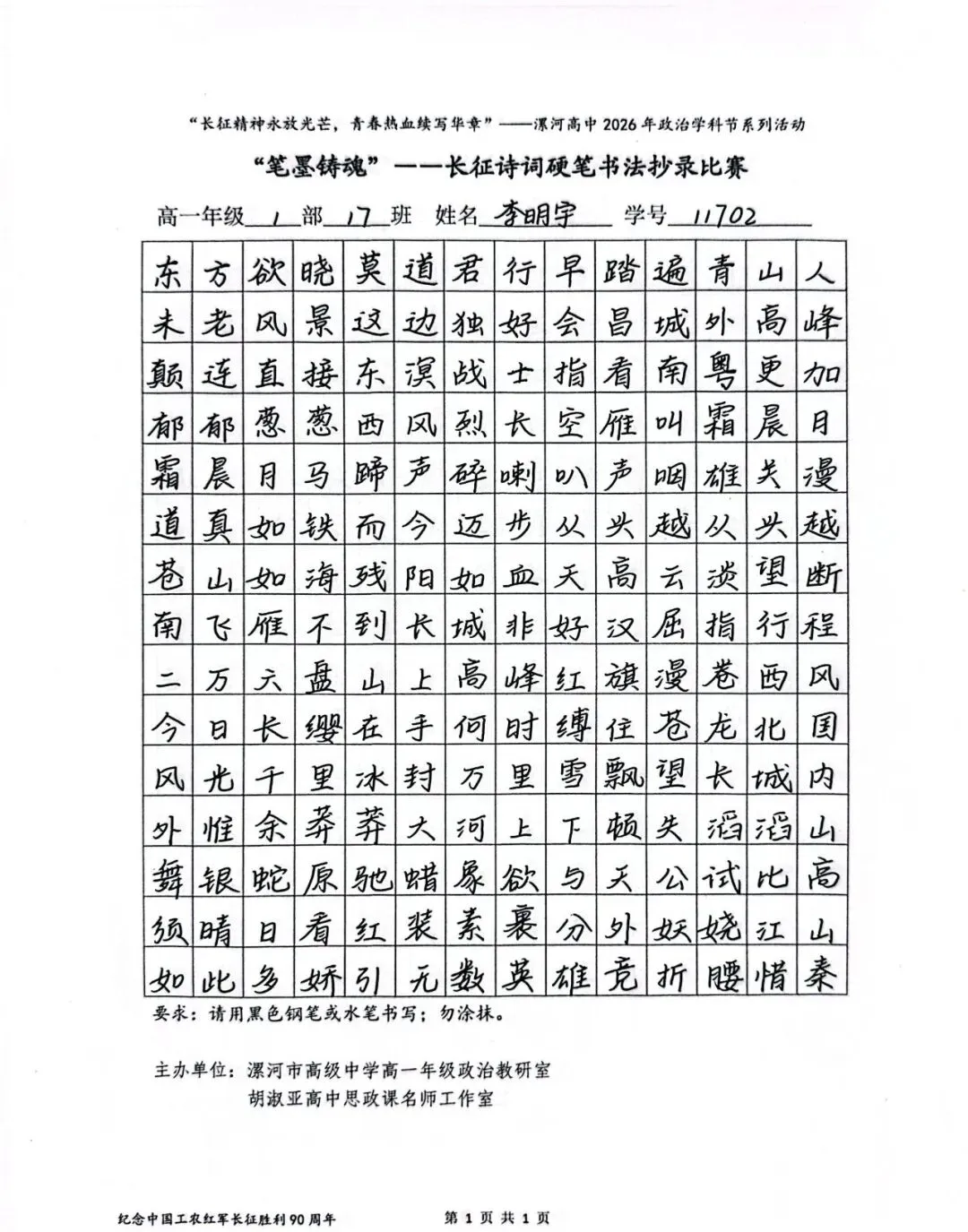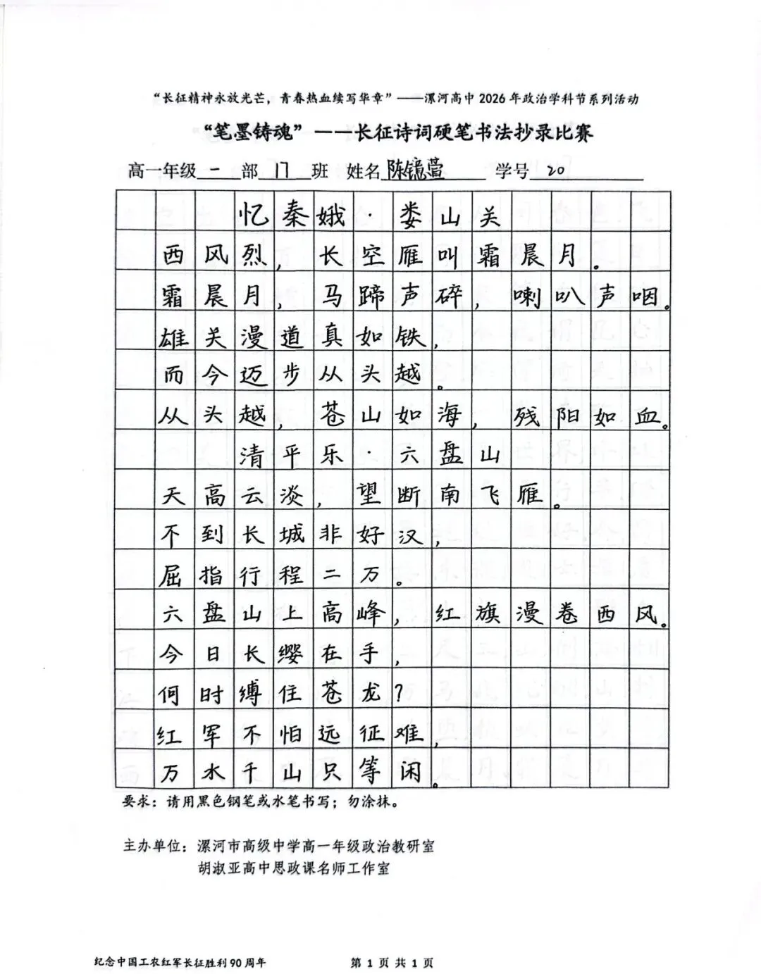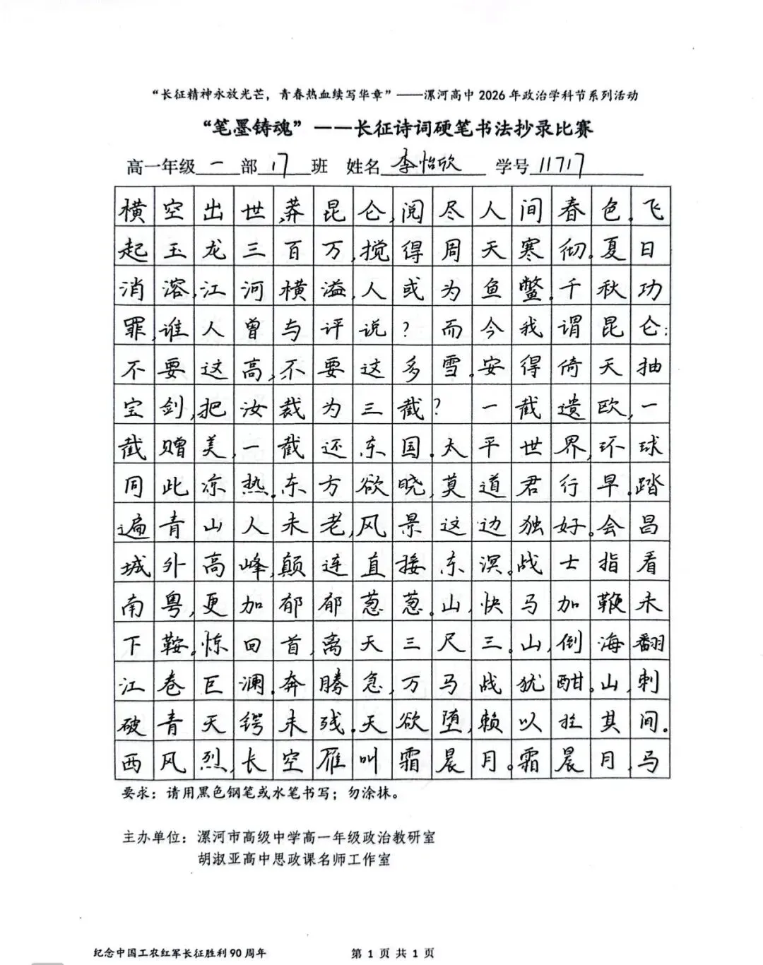 (模板)漯河市高级中学2026年思政学科节 ‖ “笔墨铸魂”——长征诗词硬笔书法比赛优秀作品展(20)为深入落实立德树人根本任务,传承和弘扬伟大长征精神,厚植爱国主义情怀,提升学生的思想政治素养与综合实践能力,丰富校园文化内涵,营造“学政治、悟初心、践使命”的浓厚氛围,4月6-10日,漯河市高级中学政治教研室联合胡淑亚高中思政课名师工作室,举办了纪念“中国工农红军长征胜利90周年”主题学科节活动。作为系列组合活动之一,“笔墨铸魂”——长征诗词硬笔书法比赛活动组收到了近4000份学生作品。同学们用笔墨重温长征经典诗词、学习中央重要讲话精神,点亮每位漯高学子自己的“长征”路。作品众多。每一份作品都饱含着漯高学子对长征精神的深刻理解,浓缩着新时代接班人对强国使命的责任担当。现将优秀作品予以展出、鼓励。感谢关注我们