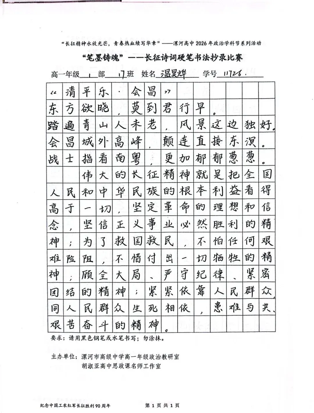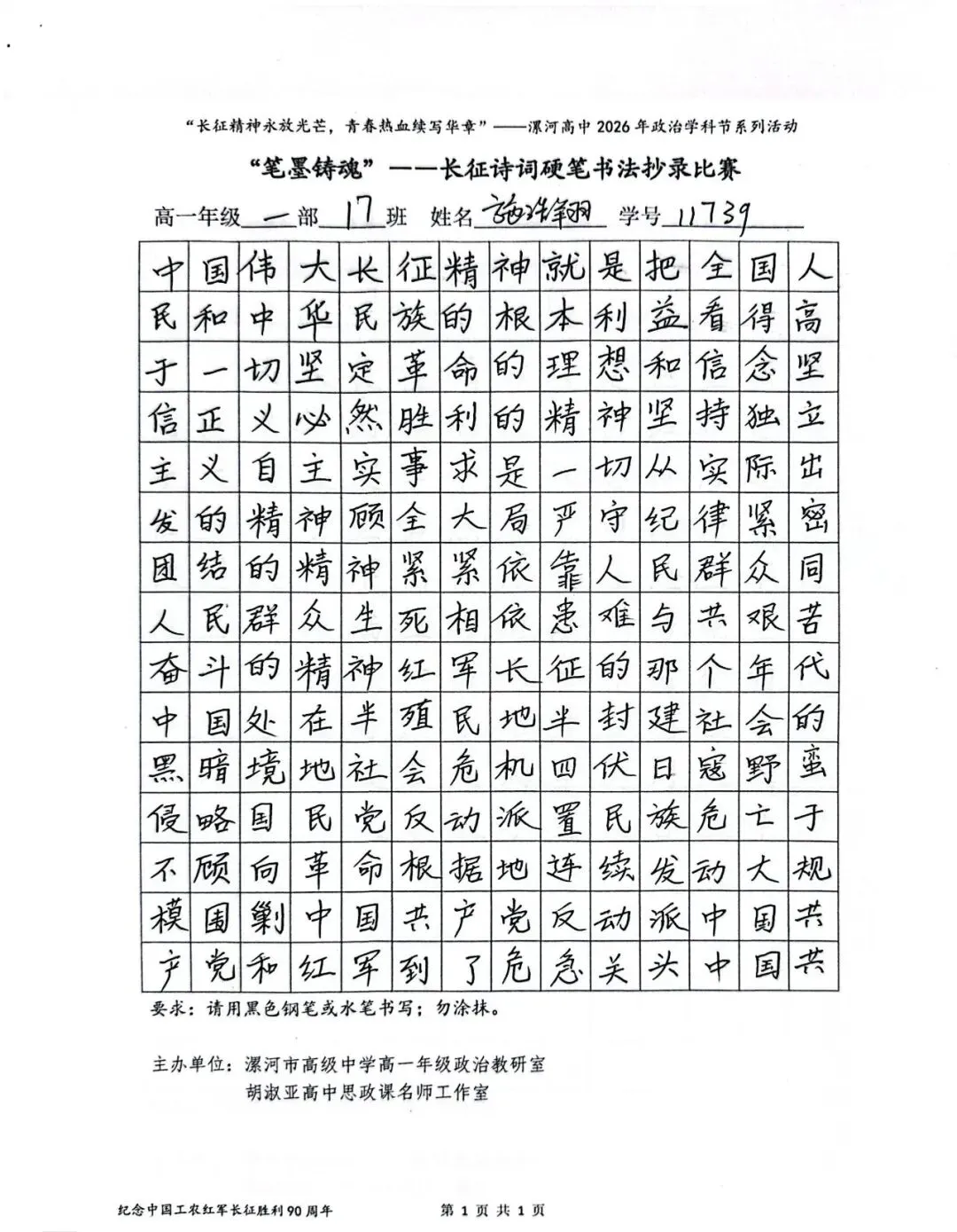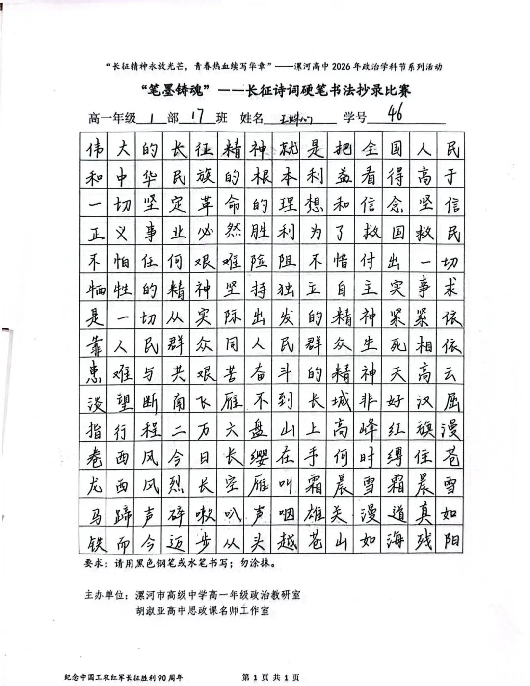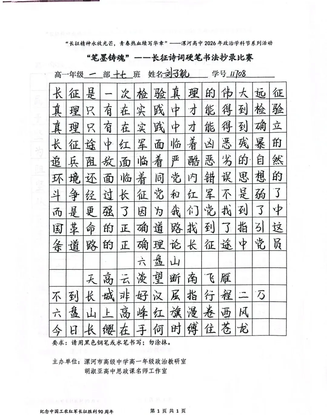 (模板)漯河市高级中学2026年思政学科节 ‖ “笔墨铸魂”——长征诗词硬笔书法比赛优秀作品展(20)为深入落实立德树人根本任务,传承和弘扬伟大长征精神,厚植爱国主义情怀,提升学生的思想政治素养与综合实践能力,丰富校园文化内涵,营造“学政治、悟初心、践使命”的浓厚氛围,4月6-10日,漯河市高级中学政治教研室联合胡淑亚高中思政课名师工作室,举办了纪念“中国工农红军长征胜利90周年”主题学科节活动。作为系列组合活动之一,“笔墨铸魂”——长征诗词硬笔书法比赛活动组收到了近4000份学生作品。同学们用笔墨重温长征经典诗词、学习中央重要讲话精神,点亮每位漯高学子自己的“长征”路。作品众多。每一份作品都饱含着漯高学子对长征精神的深刻理解,浓缩着新时代接班人对强国使命的责任担当。现将优秀作品予以展出、鼓励。感谢关注我们