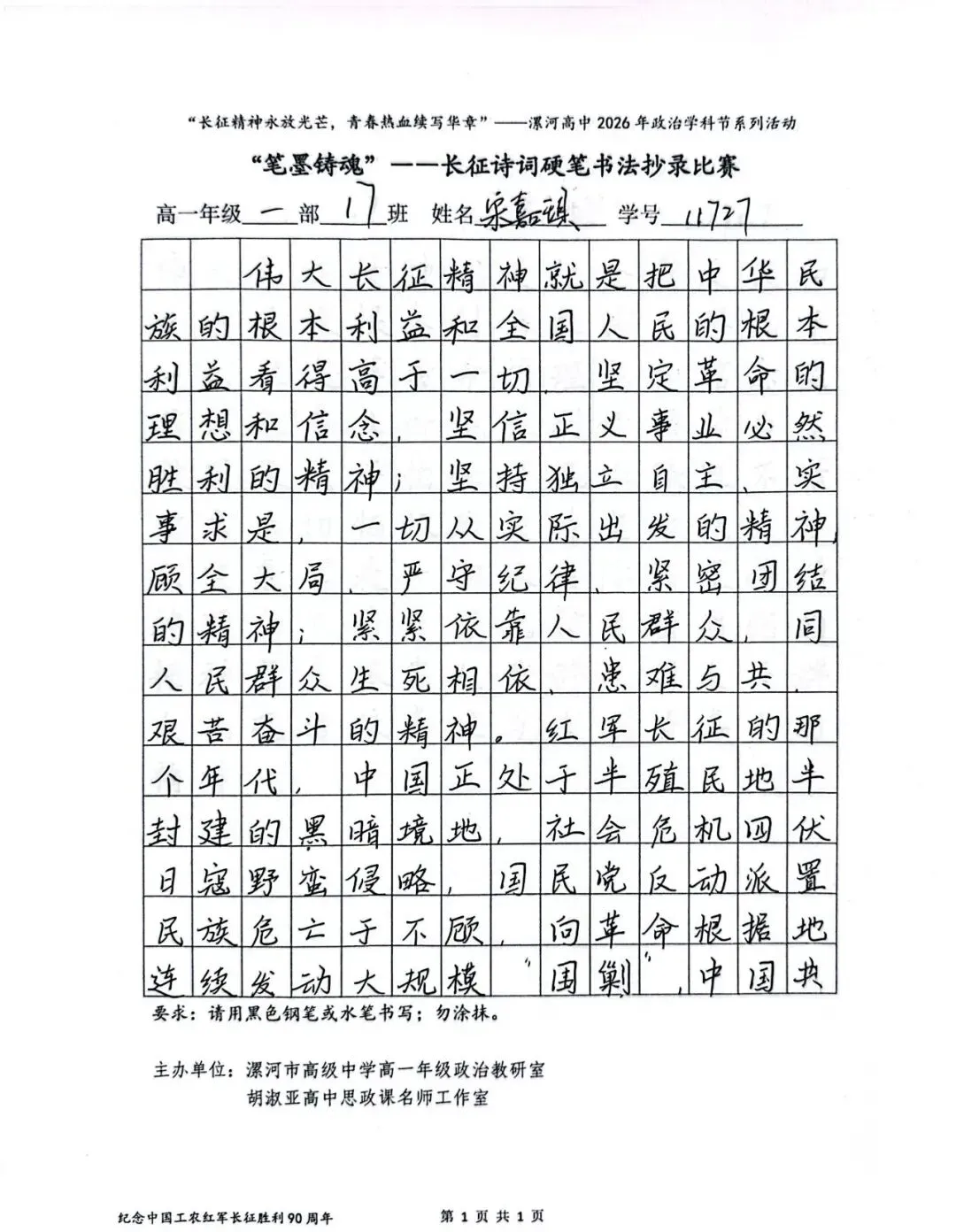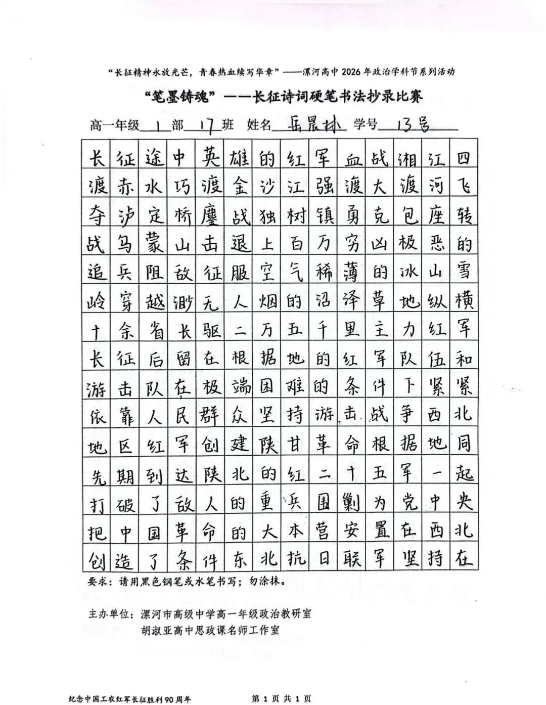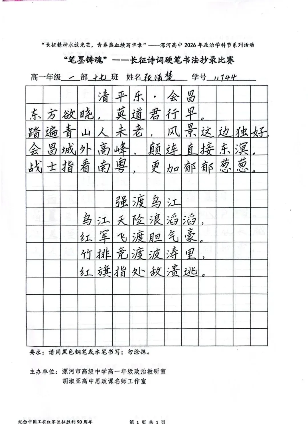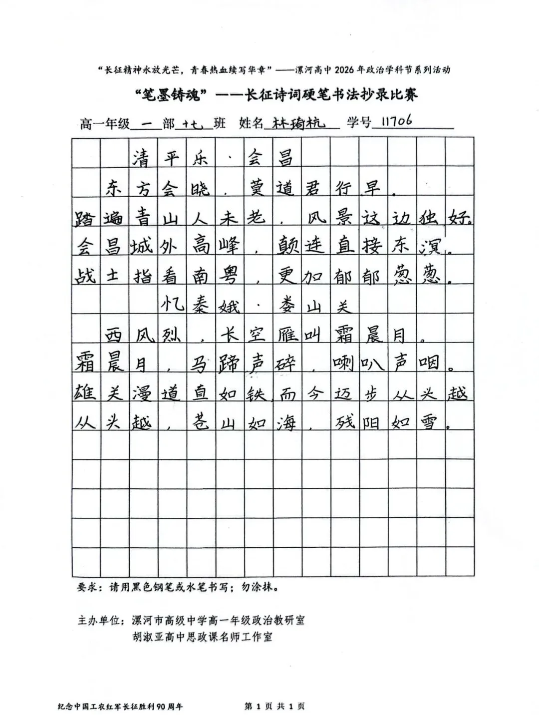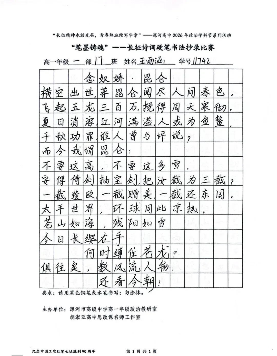 (模板)漯河市高级中学2026年思政学科节 ‖ “笔墨铸魂”——长征诗词硬笔书法比赛优秀作品展(20)为深入落实立德树人根本任务,传承和弘扬伟大长征精神,厚植爱国主义情怀,提升学生的思想政治素养与综合实践能力,丰富校园文化内涵,营造“学政治、悟初心、践使命”的浓厚氛围,4月6-10日,漯河市高级中学政治教研室联合胡淑亚高中思政课名师工作室,举办了纪念“中国工农红军长征胜利90周年”主题学科节活动。作为系列组合活动之一,“笔墨铸魂”——长征诗词硬笔书法比赛活动组收到了近4000份学生作品。同学们用笔墨重温长征经典诗词、学习中央重要讲话精神,点亮每位漯高学子自己的“长征”路。作品众多。每一份作品都饱含着漯高学子对长征精神的深刻理解,浓缩着新时代接班人对强国使命的责任担当。现将优秀作品予以展出、鼓励。感谢关注我们
