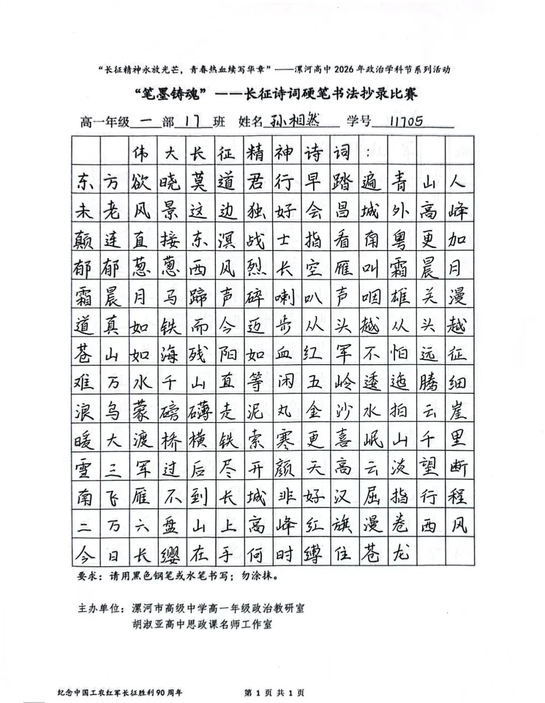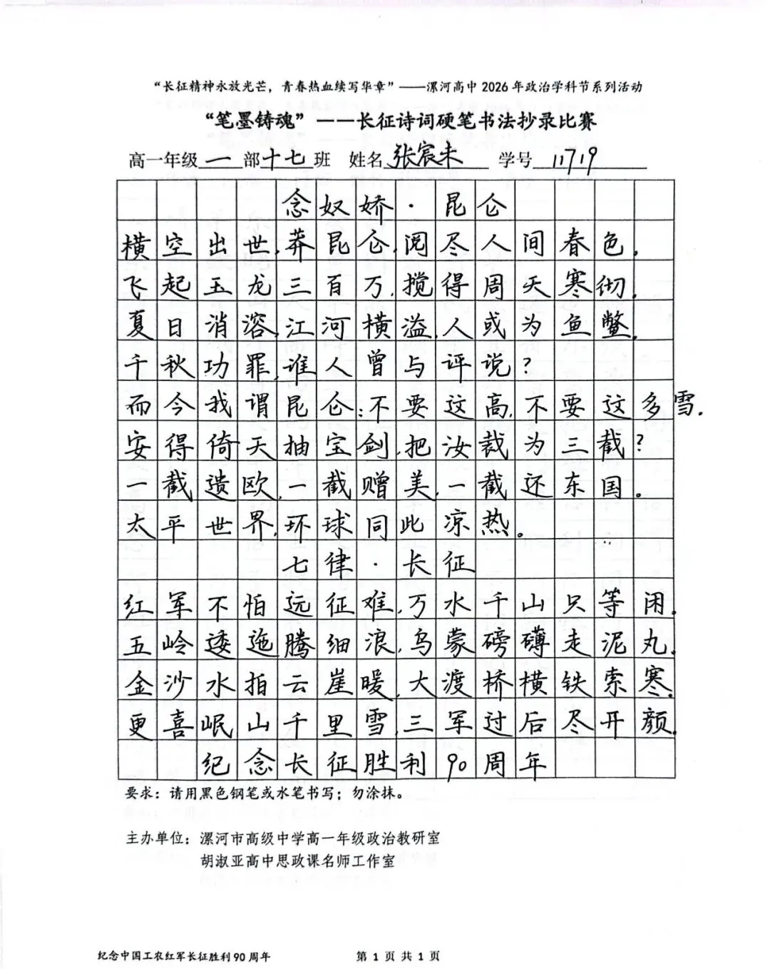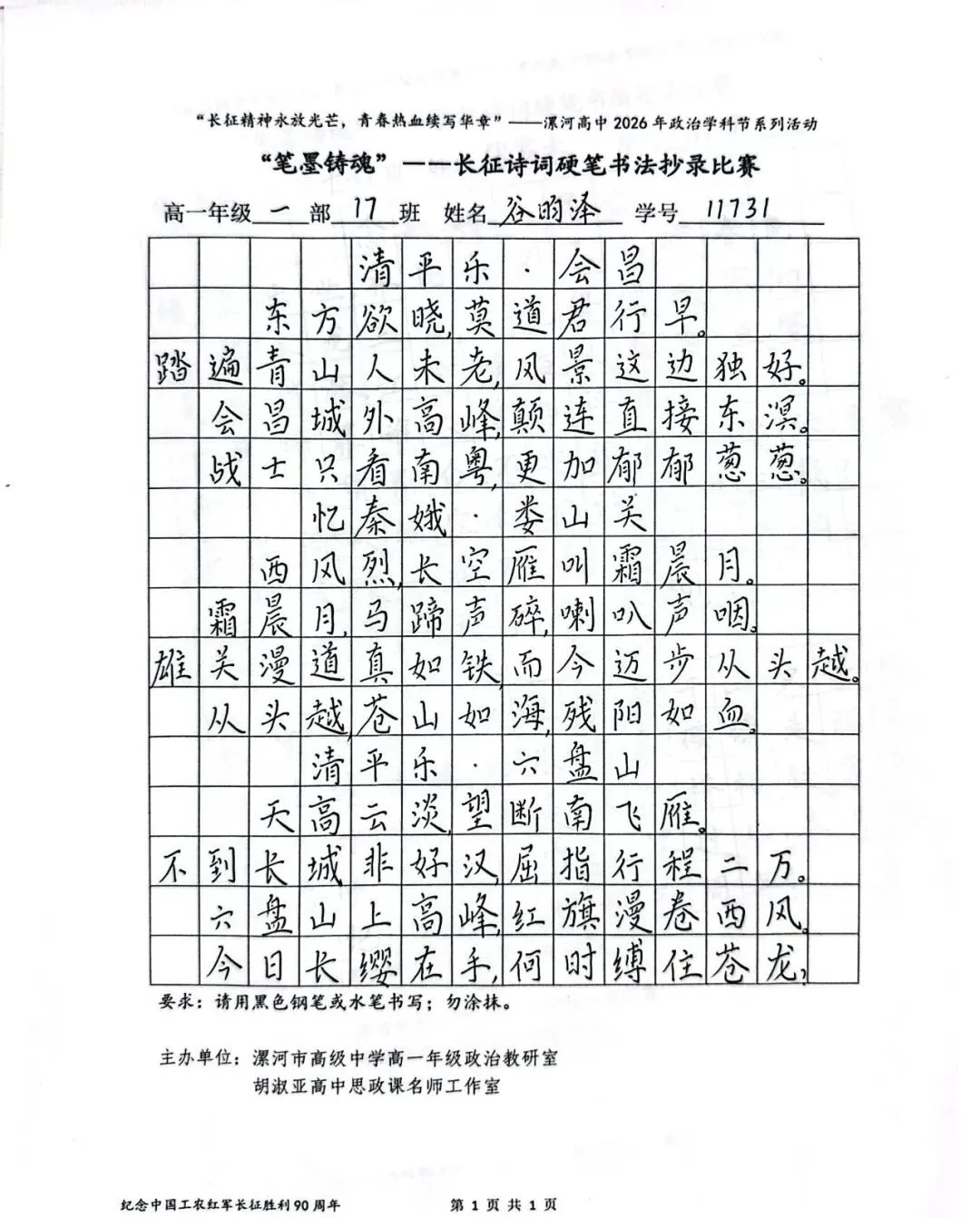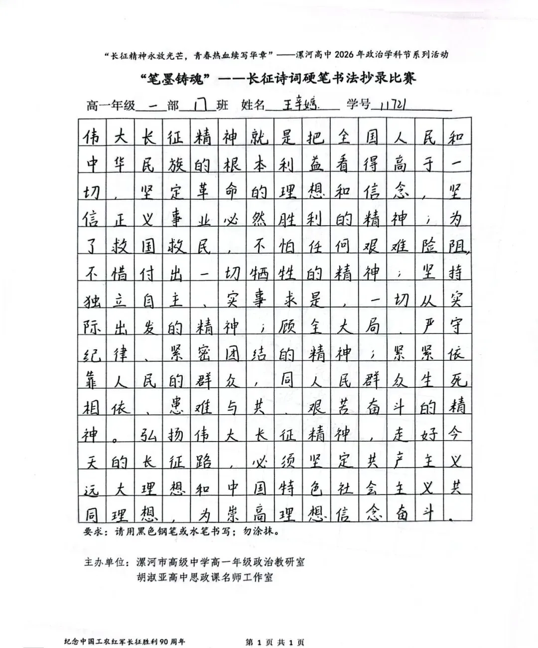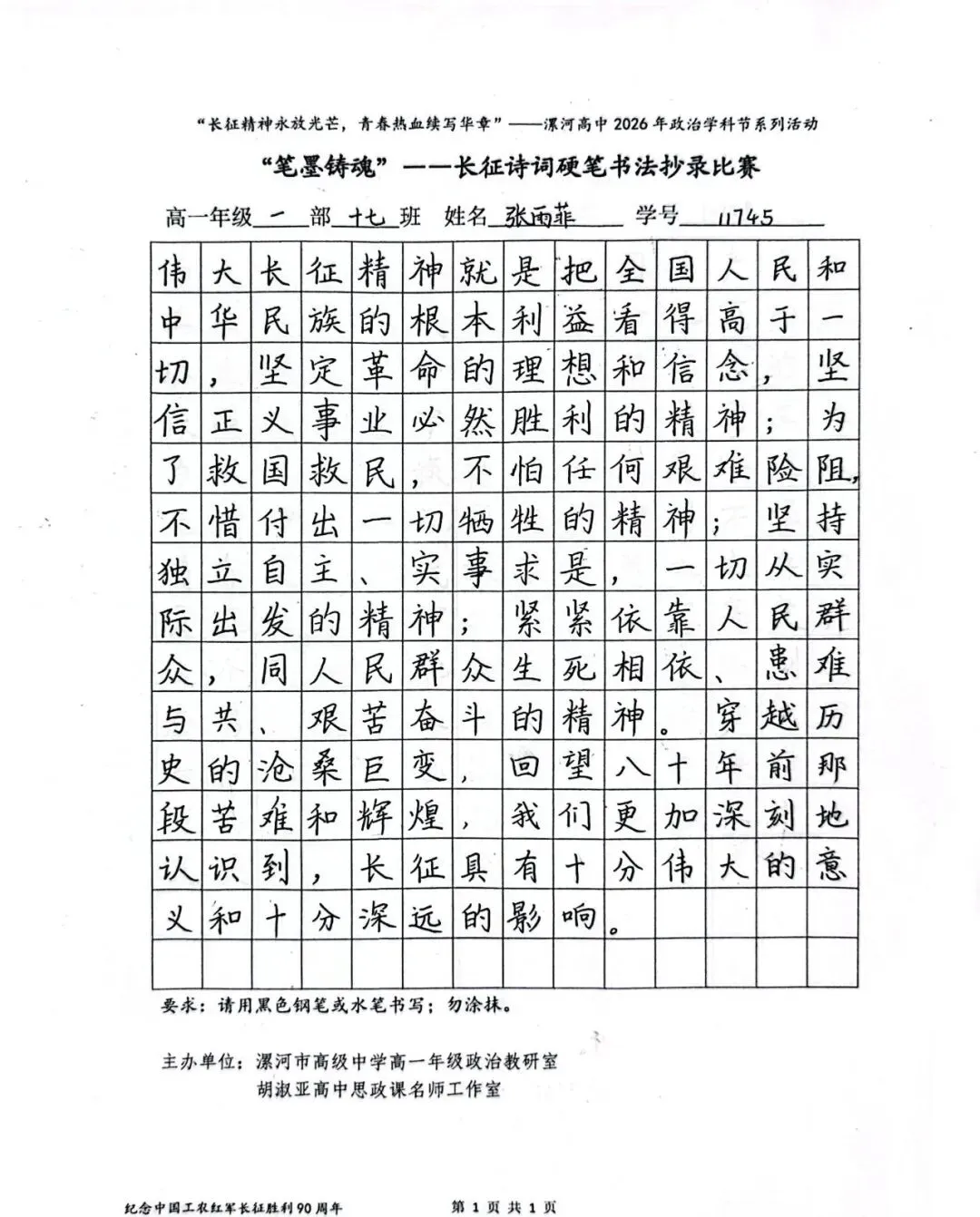 (模板)漯河市高级中学2026年思政学科节 ‖ “笔墨铸魂”——长征诗词硬笔书法比赛优秀作品展(20)为深入落实立德树人根本任务,传承和弘扬伟大长征精神,厚植爱国主义情怀,提升学生的思想政治素养与综合实践能力,丰富校园文化内涵,营造“学政治、悟初心、践使命”的浓厚氛围,4月6-10日,漯河市高级中学政治教研室联合胡淑亚高中思政课名师工作室,举办了纪念“中国工农红军长征胜利90周年”主题学科节活动。作为系列组合活动之一,“笔墨铸魂”——长征诗词硬笔书法比赛活动组收到了近4000份学生作品。同学们用笔墨重温长征经典诗词、学习中央重要讲话精神,点亮每位漯高学子自己的“长征”路。作品众多。每一份作品都饱含着漯高学子对长征精神的深刻理解,浓缩着新时代接班人对强国使命的责任担当。现将优秀作品予以展出、鼓励。感谢关注我们