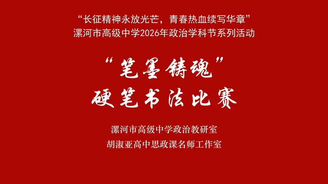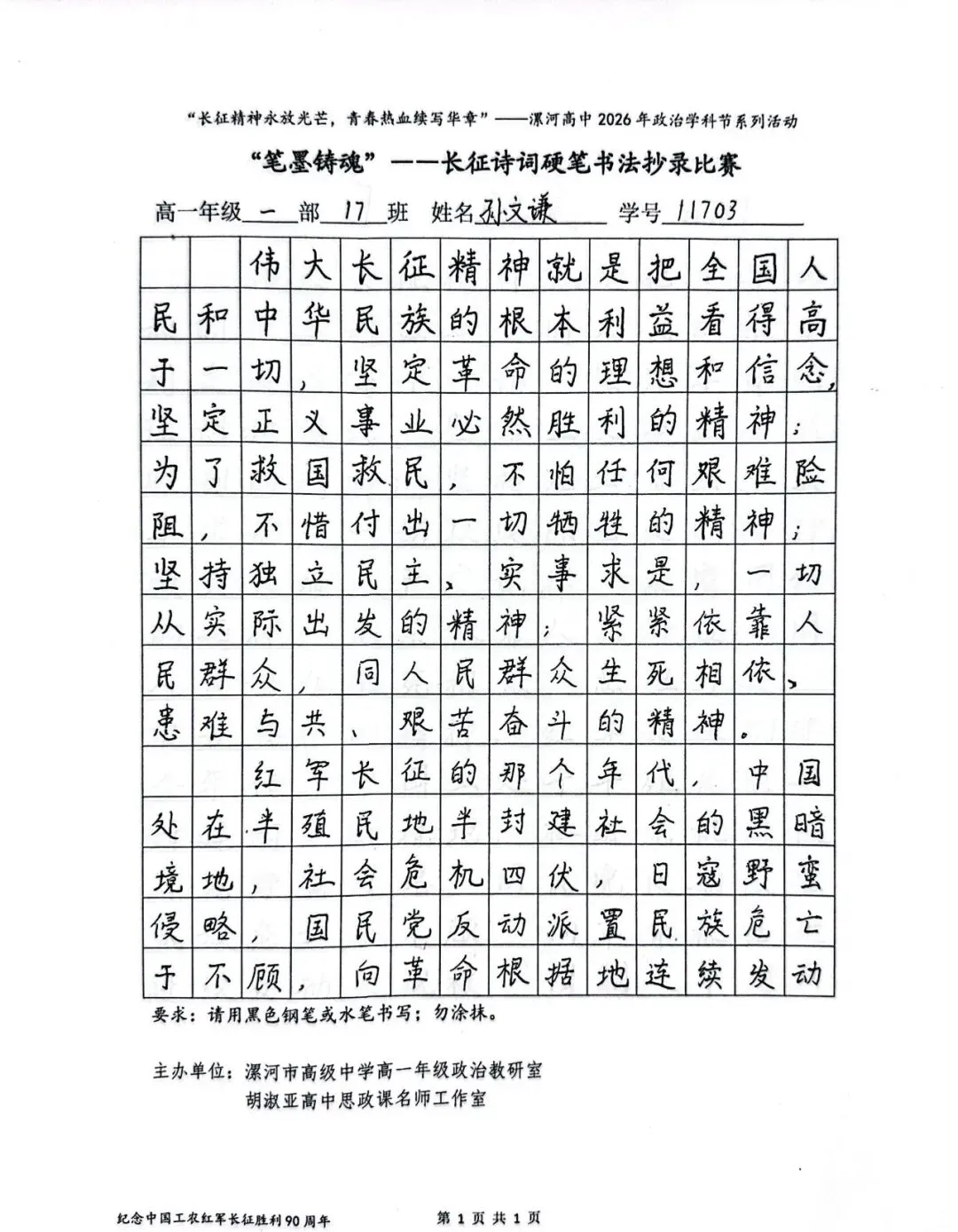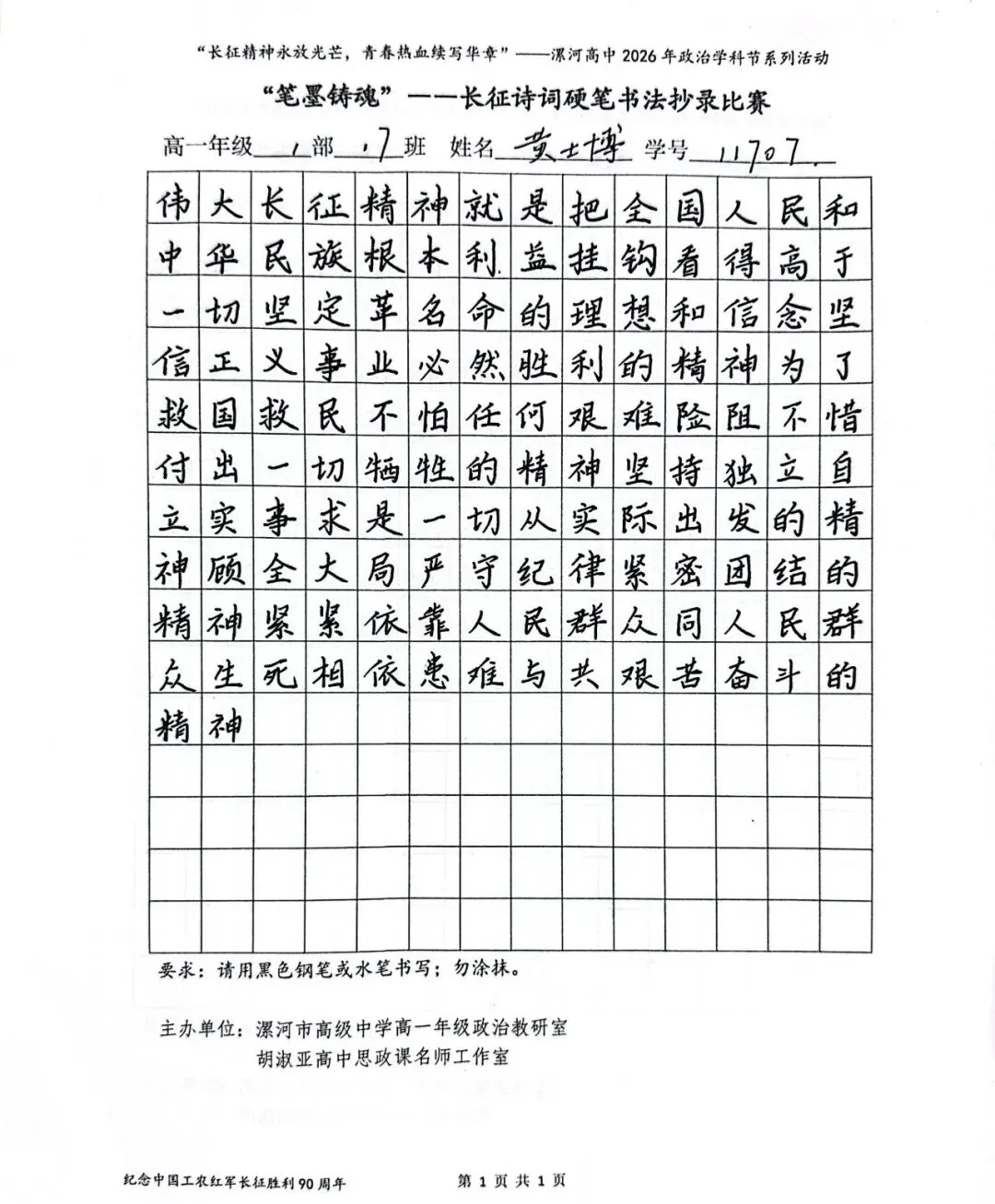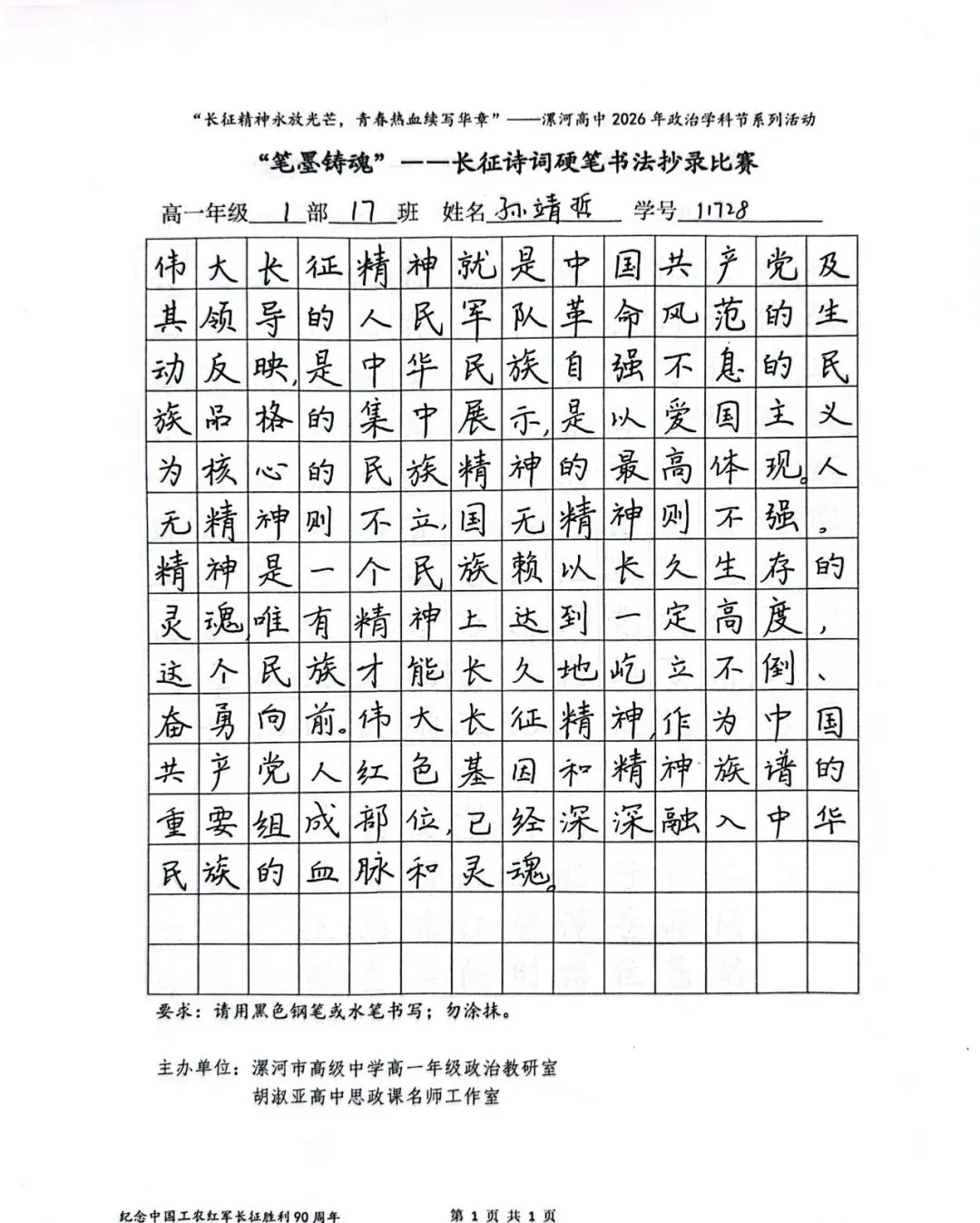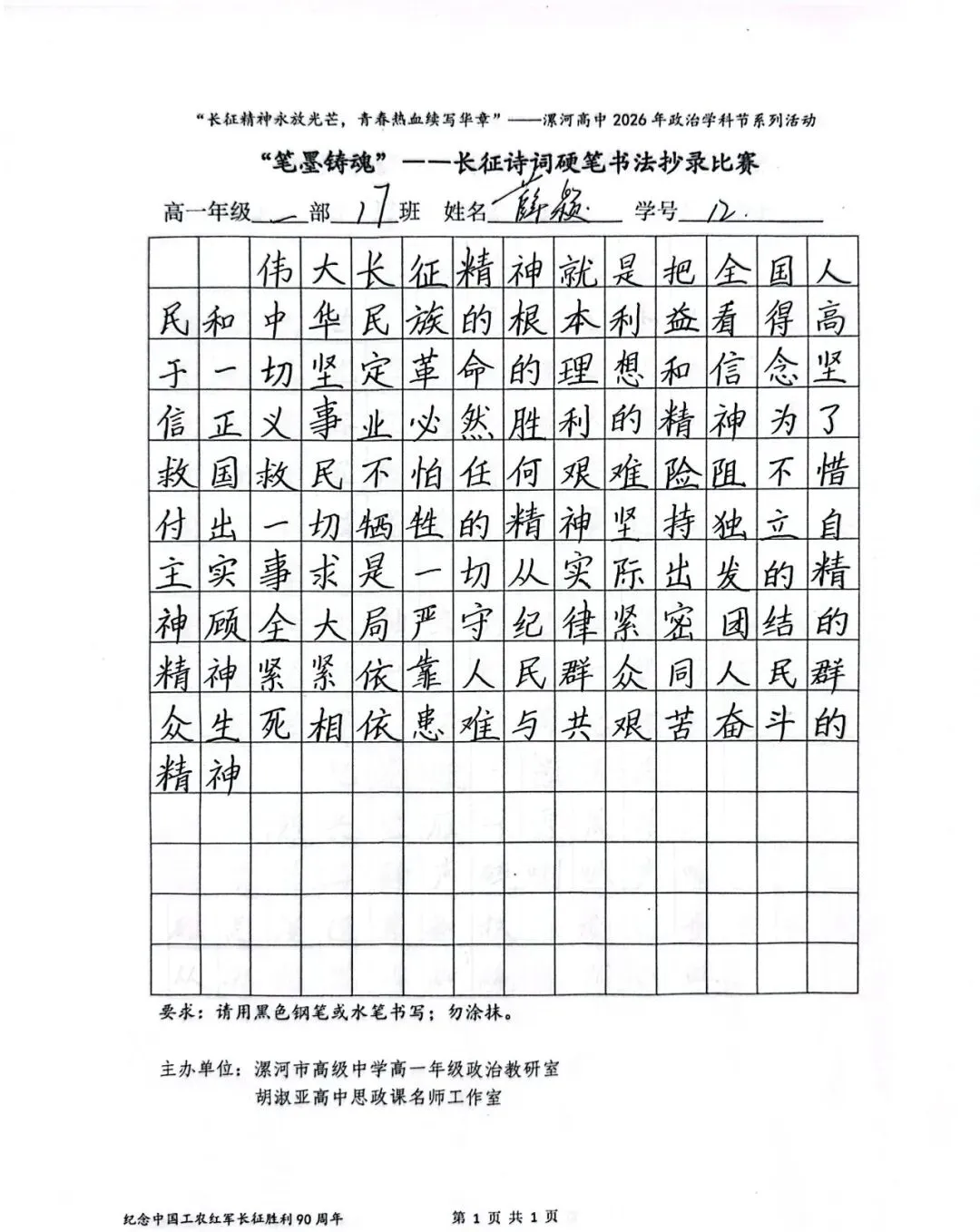 (模板)漯河市高级中学2026年思政学科节 ‖ “笔墨铸魂”——长征诗词硬笔书法比赛优秀作品展(20)为深入落实立德树人根本任务,传承和弘扬伟大长征精神,厚植爱国主义情怀,提升学生的思想政治素养与综合实践能力,丰富校园文化内涵,营造“学政治、悟初心、践使命”的浓厚氛围,4月6-10日,漯河市高级中学政治教研室联合胡淑亚高中思政课名师工作室,举办了纪念“中国工农红军长征胜利90周年”主题学科节活动。作为系列组合活动之一,“笔墨铸魂”——长征诗词硬笔书法比赛活动组收到了近4000份学生作品。同学们用笔墨重温长征经典诗词、学习中央重要讲话精神,点亮每位漯高学子自己的“长征”路。作品众多。每一份作品都饱含着漯高学子对长征精神的深刻理解,浓缩着新时代接班人对强国使命的责任担当。现将优秀作品予以展出、鼓励。感谢关注我们