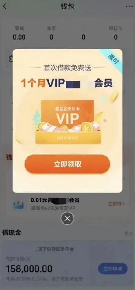 △某视频平台“免费领1个月VIP”,点击后会跳转到借贷申请页面。