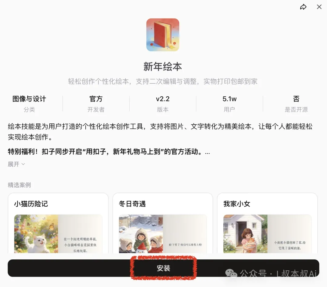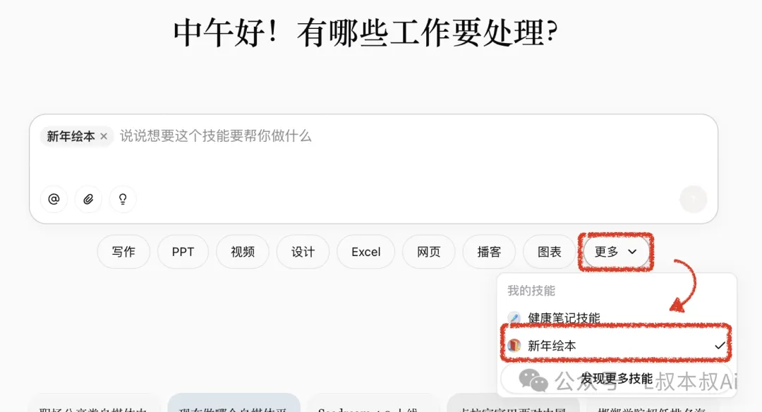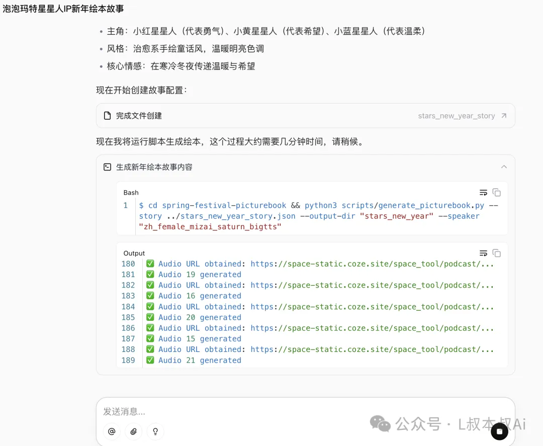 那么「新年绘本」技能,就会调用,且Ai开始按照这个技能文档里面的步骤开始去执行,相当于你给员工写了一套「新年绘本」的SOP,然后后续的员工在执行相关工作时,都会按照这个SOP去进行。