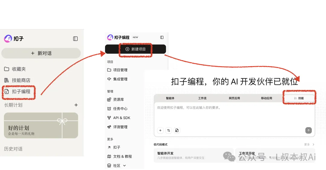 点击「新建项目」在开发项目聊天窗口里面选择「技能」