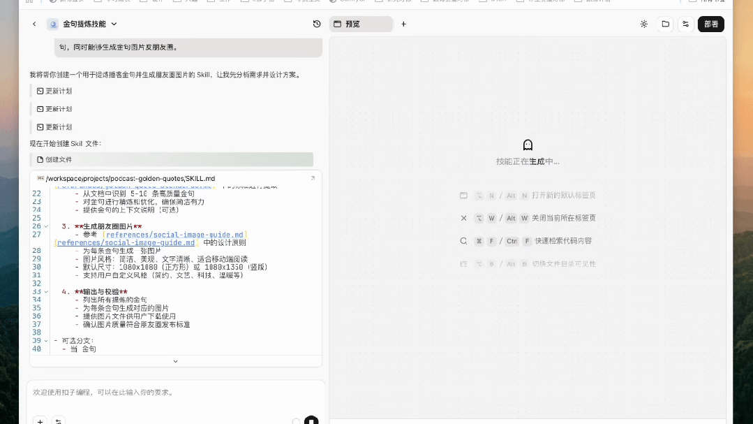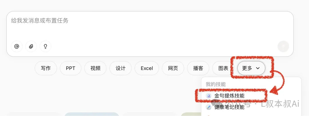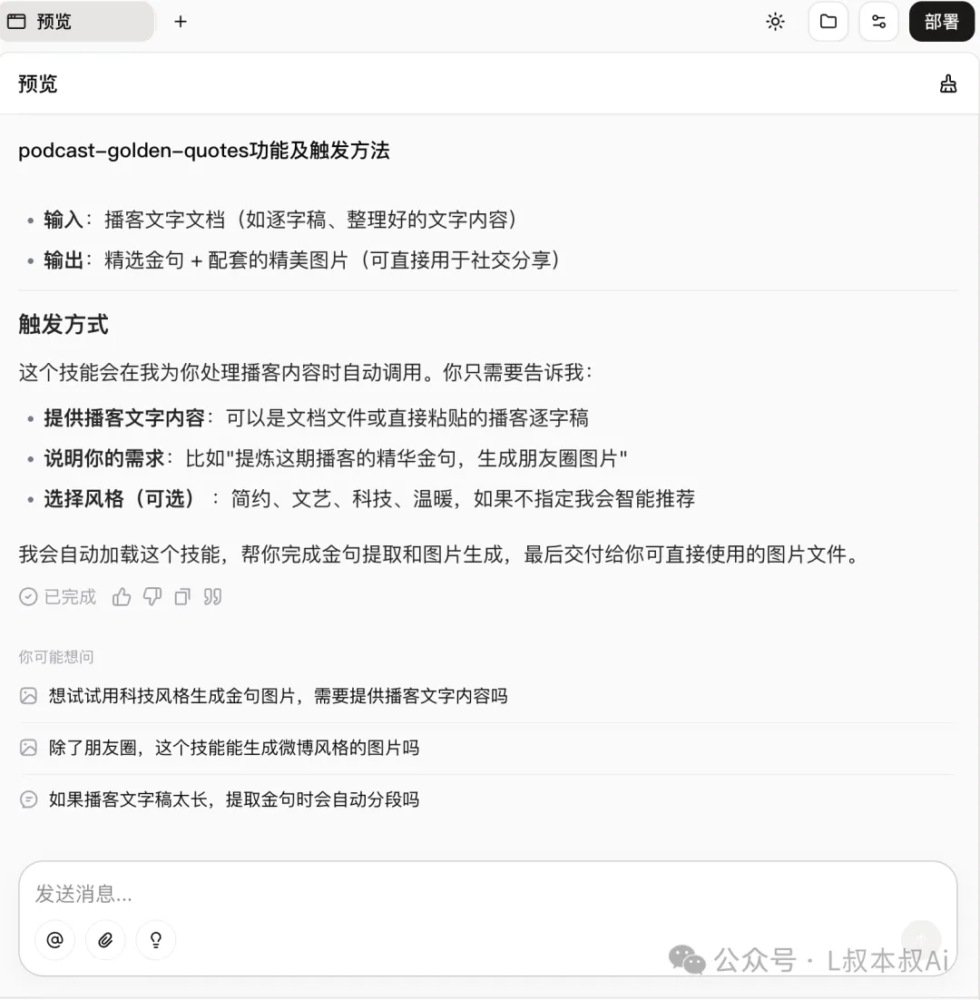 当部署成功之后!你就可以随时在coze主页的聊天窗口里,选择「技能」调用这个「金句提炼」技能了!