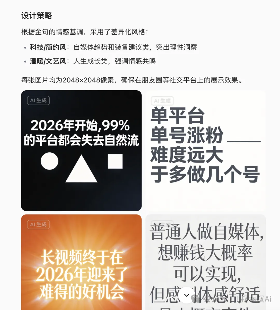 过一会儿,Ai就可以快速的帮你利用指令,快速的提炼金句并且帮你生成可用的朋友圈图片