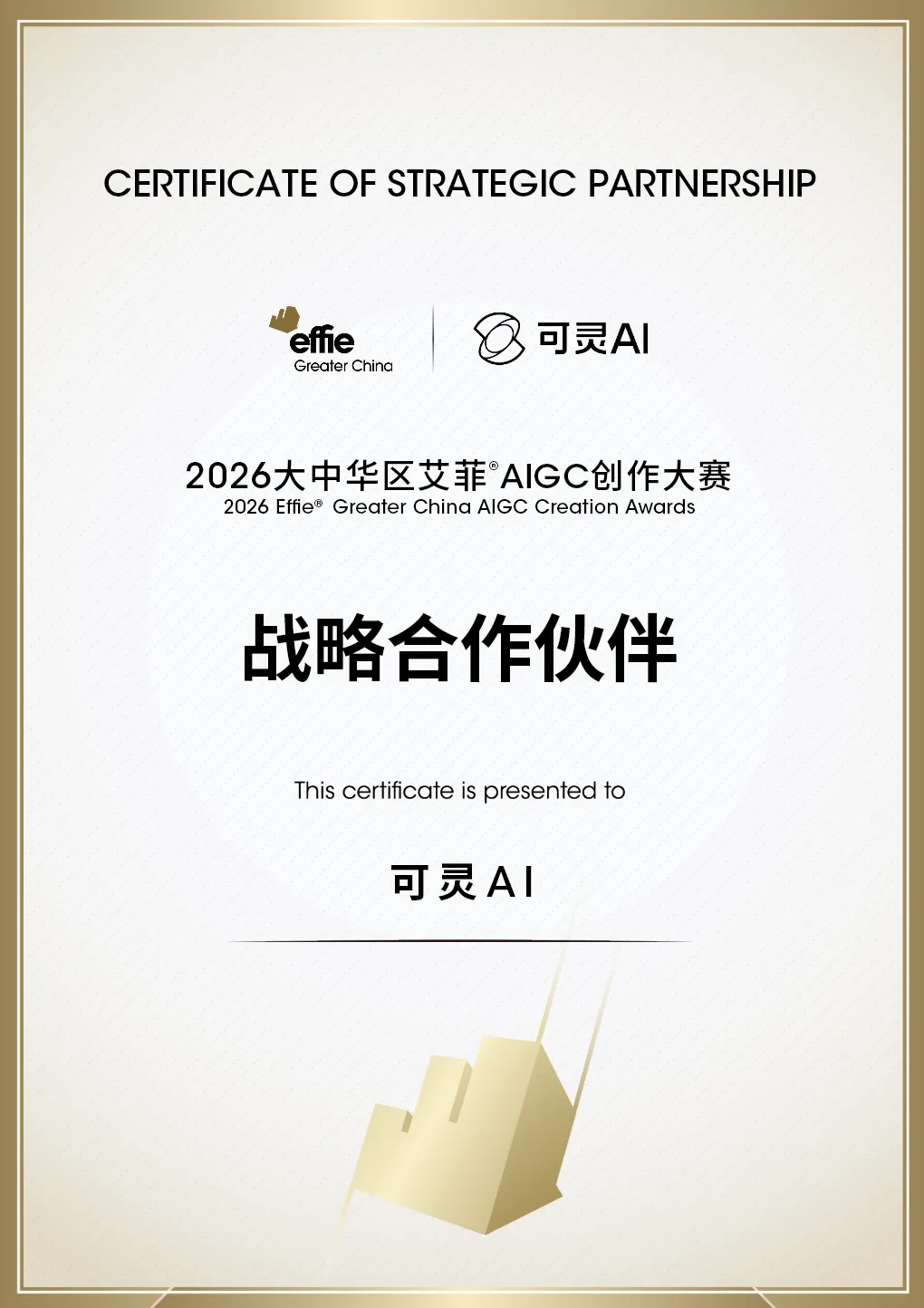 作为艾菲首个深度聚焦AIGC创作领域的实效大奖——2026大中华区艾菲AIGC创作大赛(2026 Effie Greater China AIGC Creation Awards)的官方指定工具平台,可灵AI将发挥全球头部AI工具平台影响力,与艾菲共建高水平AIGC创作赛事,并为每件参赛作品提供赛事额度的灵感值,助力AIGC技术与创意深度融合。