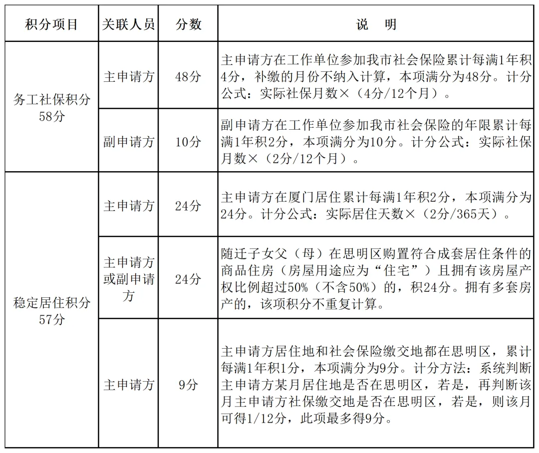 ②本项积分具体计算到自然月,积分系统先判断随迁子女父(母)某个月是否居住在思明区,若是,再判断该月的社保缴交地是否在思明区,若是,则该月可得积分1/12分,以此类推,本项最多得9分。
