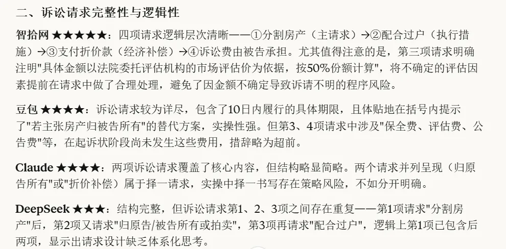 诉讼请求的设计上,智合AI的四项请求层次也最为清晰:分割房产→配合过户→支付折价款→诉讼费由被告承担,且第三项明确注明“以市场评估价为依据、按50%份额计算”,提前化解了程序风险。