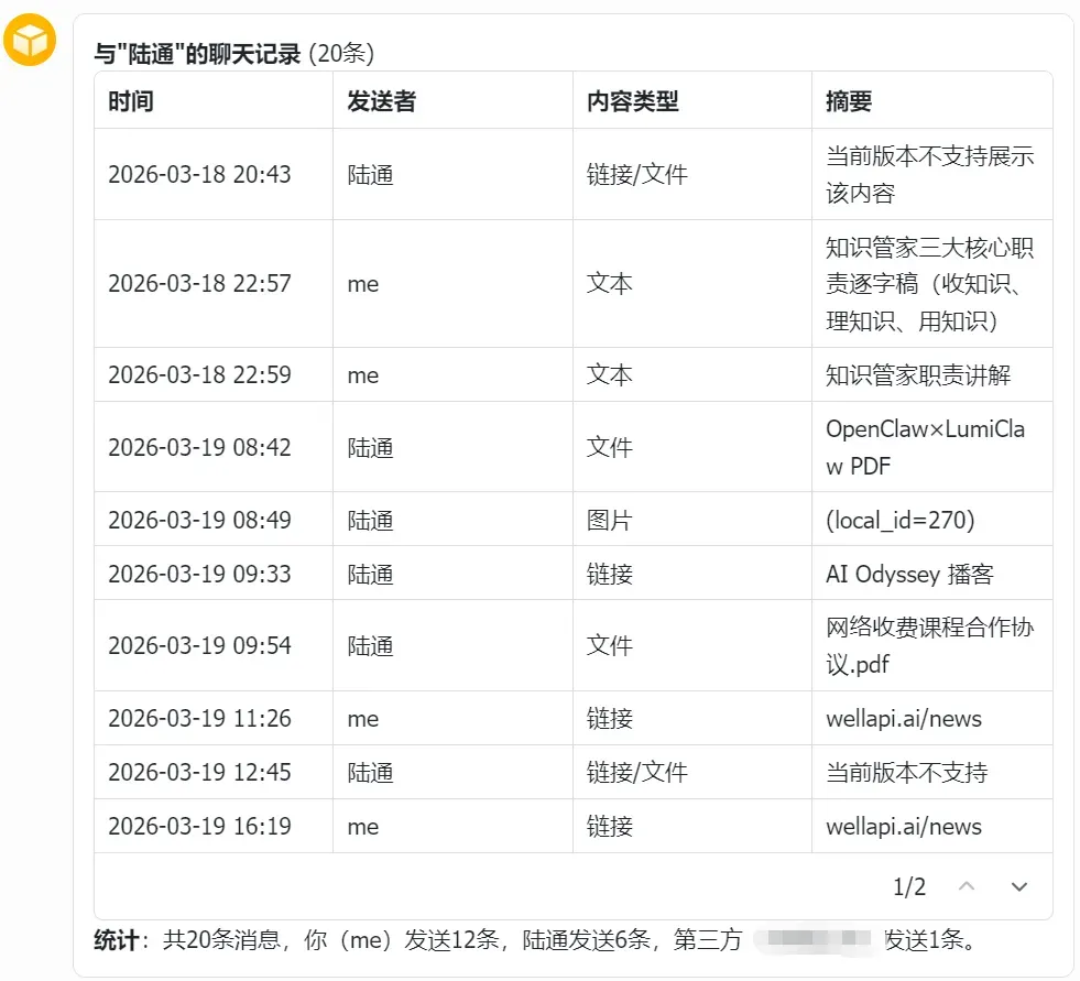 1、查看与“陆通”的最近20条信息(我使用了我另外一个微信号)