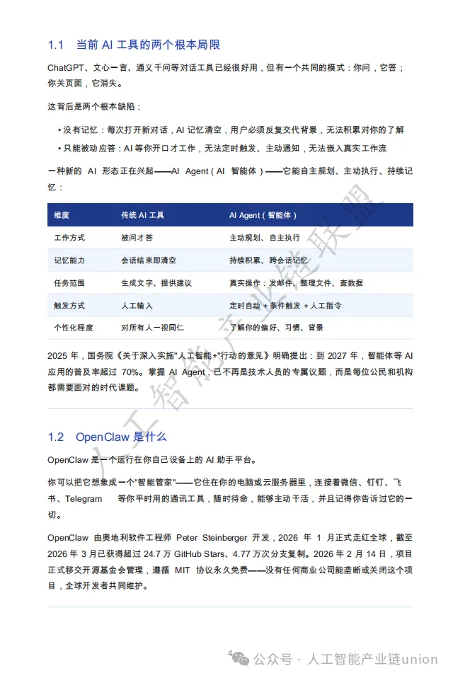 而一种新的AI形态——AI Agent(AI智能体)正在兴起。它能自主规划、主动执行、持续记忆。OpenClaw正是这种新形态的典型代表。